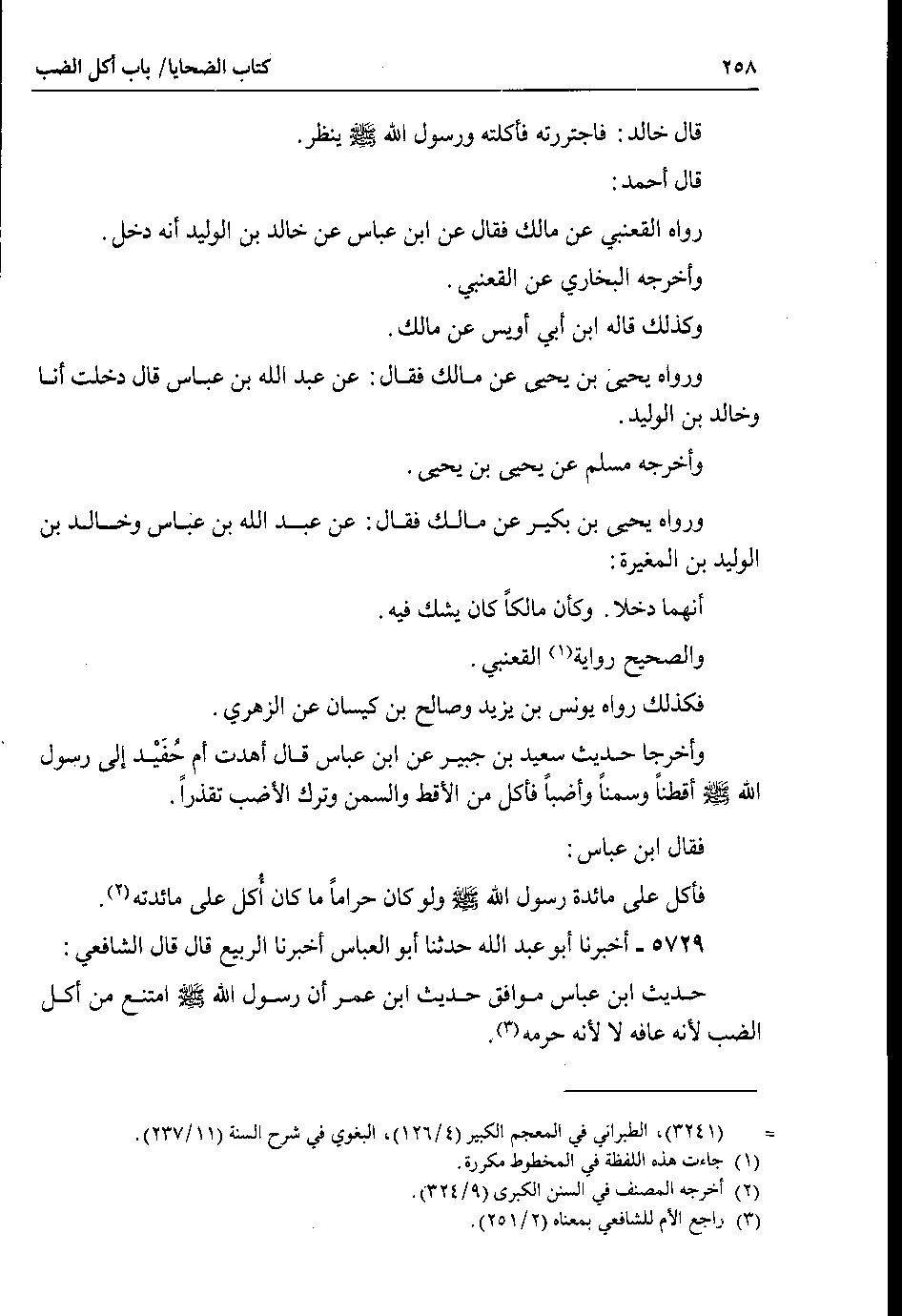 5729 - أخبرنا أبو عبد الله حدثنا أبو العباس أخبرنا الربيع قال قال الشافعي : حديث ابن عباس موافق حديث ابن عمر أن رسول الله صلى الله عليه وسلم امتنع عن أكل الضب لأنه عافه لا لأنه حرمه.