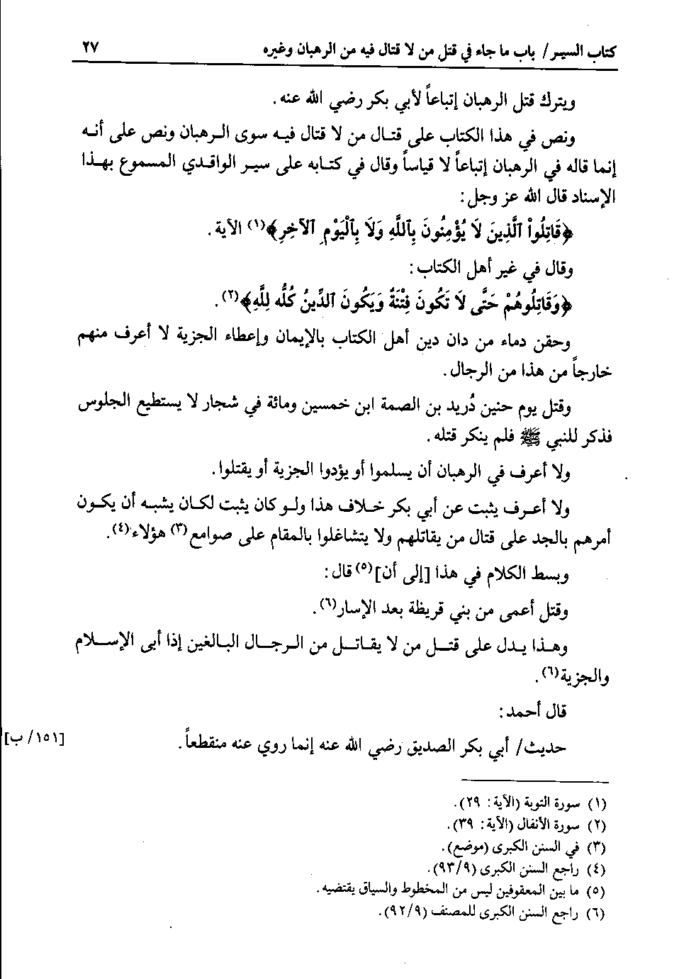 ونص في هذا الكتاب على قتال من لا قتال فيه سوى الرهبان ونص على أنه إنما قاله في الرهبان إتباعاً لا قياساً وقال في كتابه على سير الواقدي المسموع بهذا الإسناد قال الله عز وجل : {قاتلوا الذين لا يؤمنون بالله ولا باليوم الآخر} الآية.