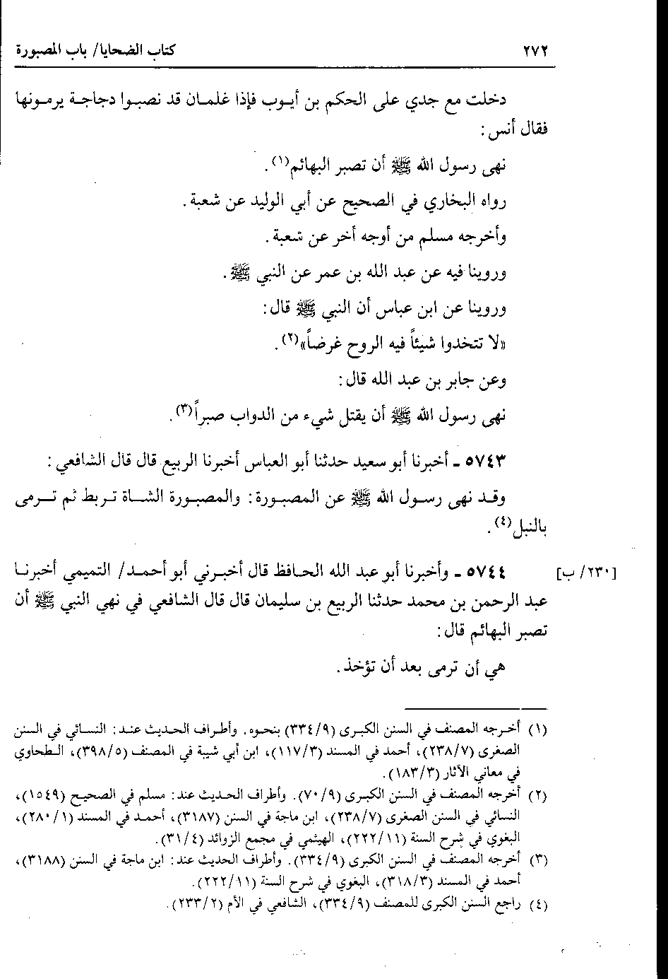 5744 - وأخبرنا أبو عبد الله الحافظ قال أخبرني أبو أحمد 230 ب التميمي أخبرنا عبد الرحمن بن محمد حدثنا الربيع بن سليمان قال قال الشافعي في نهي النبي صلى الله عليه وسلم أن تصبر البهائم قال : هي أن ترمى بعد أن تؤخذ.