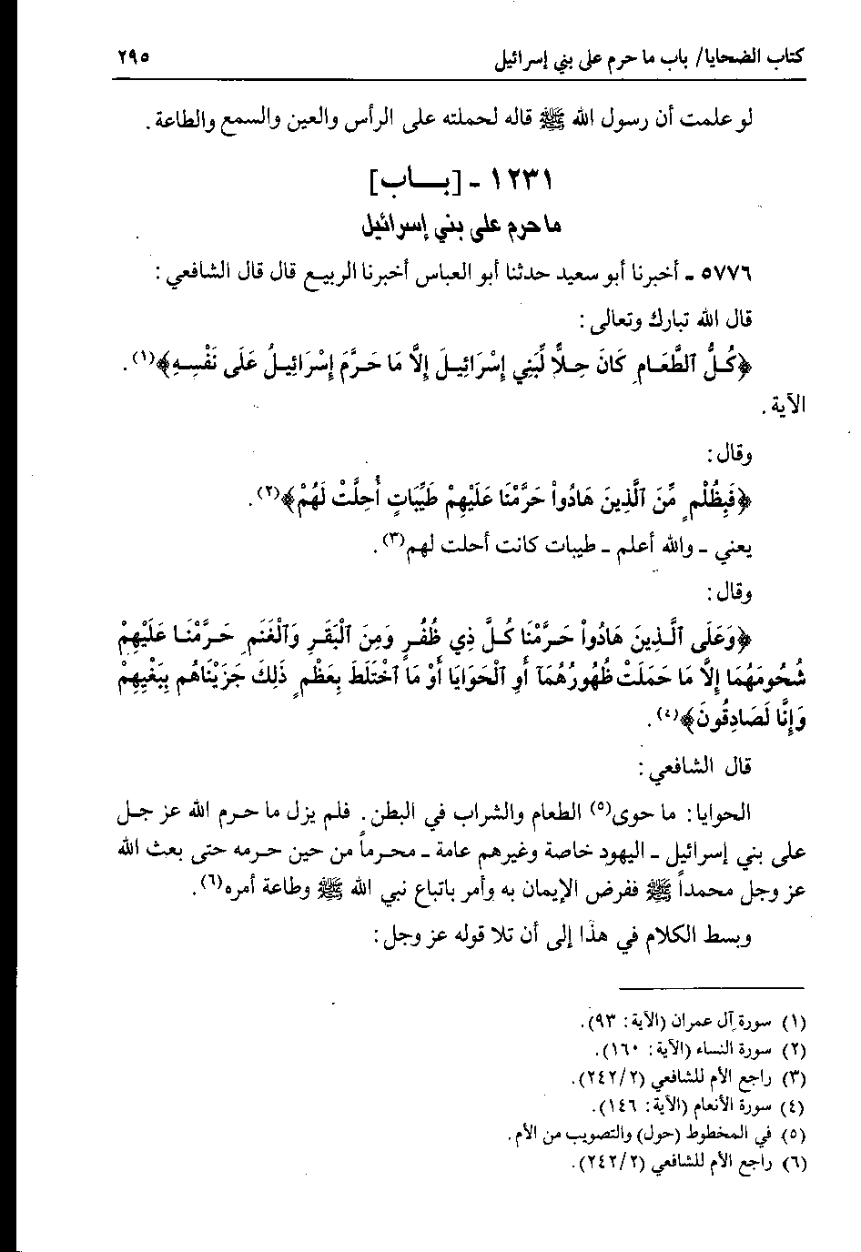 5776 - أخبرنا أبو سعيد حدثنا أبو العباس أخبرنا الربيع قال قال الشافعي : قال الله تبارك وتعالى : {كل الطعام كان حلا لبني إسرائيل إلا ما حرم إسرائيل على نفسه}.