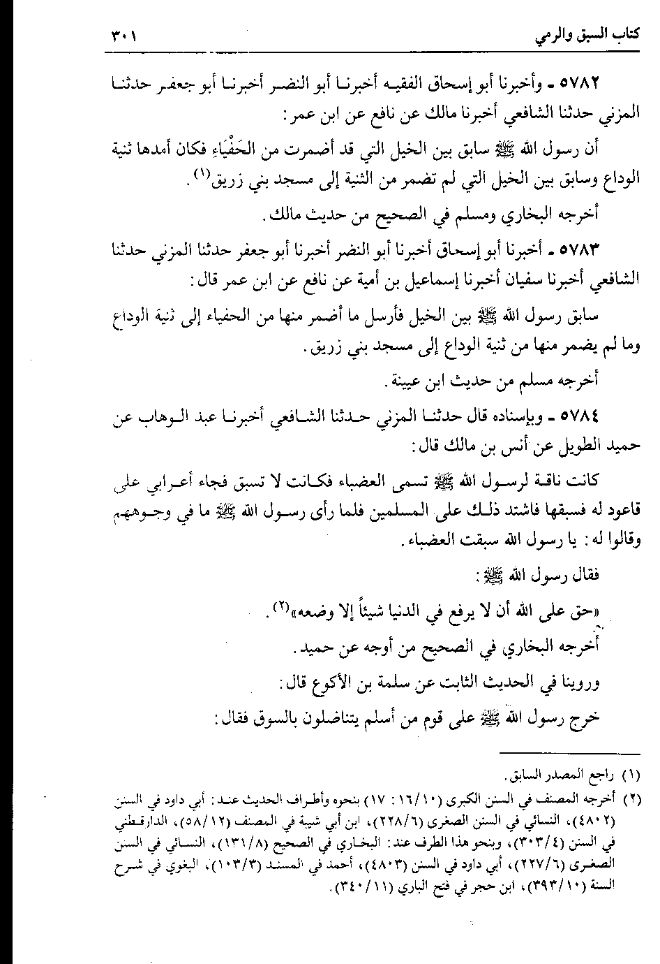 5784 - وبإسناده قال حدثنا المزني حدثنا الشافعي أخبرنا عبد الوهاب عن حميد الطويل عن أنس بن مالك قال : كانت ناقة لرسول الله صلى الله عليه وسلم تسمى العضباء فكانت لا تسبق فجاء أعرابي على قاعود له فسبقها فاشتد ذلك على المسلمين فلما رأى رسول الله صلى الله عليه وسلم ما في وجوههم وقالوا له : يا رسول الله سبقت العضباء.