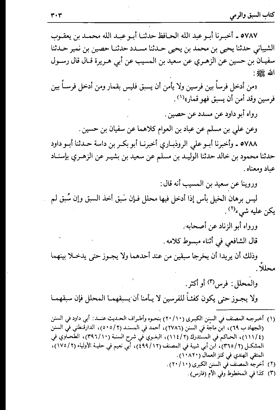 5787 - أخبرنا أبو عبد الله الحافظ حدثنا أبو عبد الله محمد بن يعقوب الشيباني حدثنا يحيى بن محمد بن يحيى حدثنا مسدد حدثنا حصين بن نمير حدثنا سفيان بن حسين عن الزهري عن سعيد بن المسيب عن أبي هريرة قال قال رسول الله صلى الله عليه وسلم : من أدخل فرساً بين فرسين ولا يأمن أن يسبق فليس بقمار ومن أدخل فرساً بين فرسين وقد أمن أن يسبق فهو قمار.