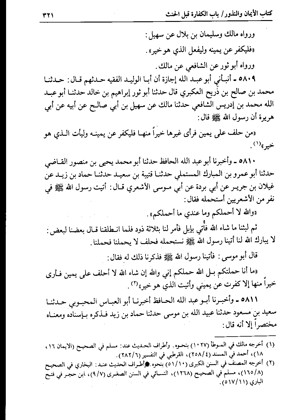 5809 - أنبأني أبو عبد الله إجازة أن أبا الوليد الفقيه حدثهم قال : حدثنا محمد بن صالح بن ذريح العكبري قال حدثنا أبو ثور إبراهيم بن خالد حدثنا أبو عبد الله محمد بن إدريس الشافعي حدثنا مالك عن سهيل بن أبي صالح عن أبيه عن أبي هريرة أن رسول الله صلى الله عليه وسلم قال : من حلف على يمين فرأى غيرها خيراً منها فليكفر عن يمينه وليأت الذي هو خير.
