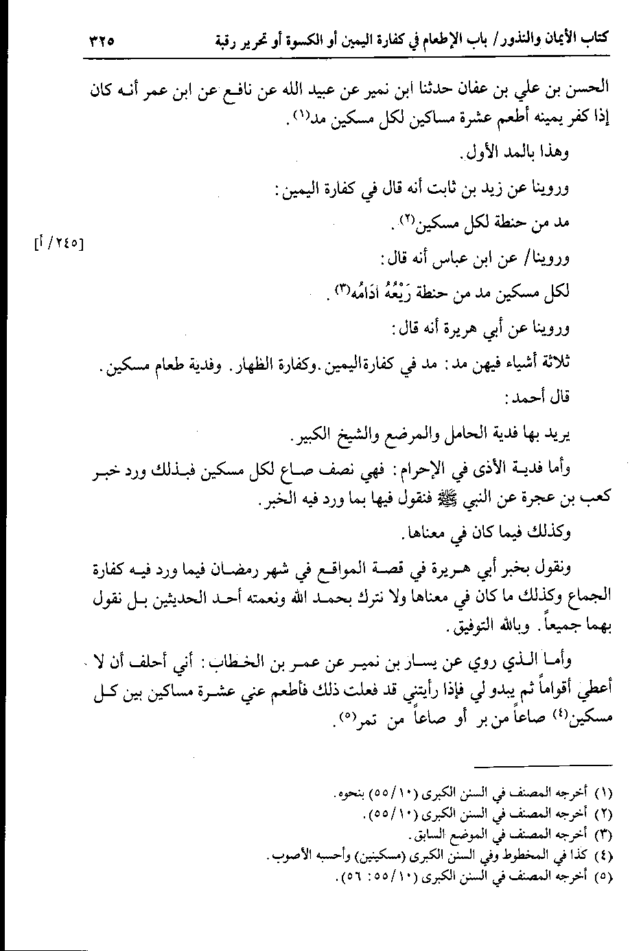 الحسن بن علي بن عفان حدثنا ابن نمير عن عبيد الله عن نافع عن ابن عمر أنه كان إذا كفر يمينه أطعم عشرة مساكين لكل مسكين مد.