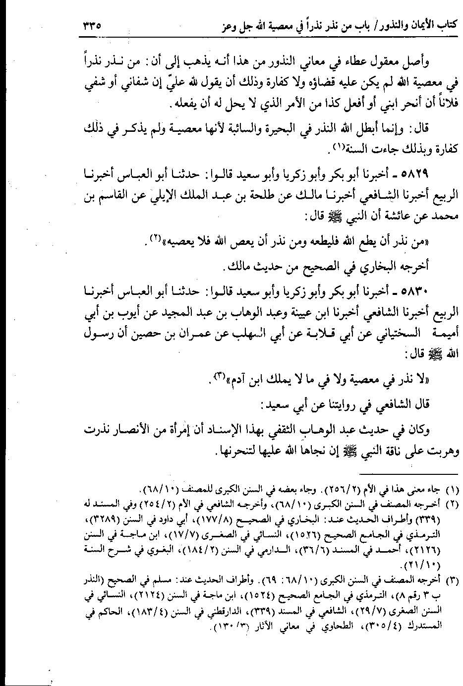 5829 - أخبرنا أبو بكر وأبو زكريا وأبو سعيد قالوا : حدثنا أبو العباس أخبرنا الربيع أخبرنا الشافعي أخبرنا مالك عن طلحة بن عبد الملك الإيلي عن القاسم بن محمد عن عائشة أن النبي صلى الله عليه وسلم قال : من نذر أن يطع الله فليطعه ومن نذر أن يعص الله فلا يعصيه.