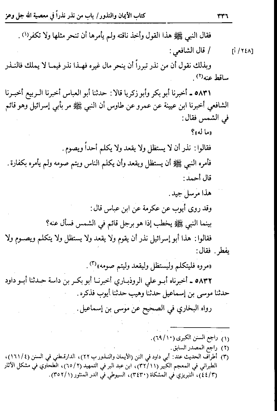 5831 - أخبرنا أبو بكر وأبو زكريا قالا : حدثنا أبو العباس أخبرنا الربيع أخبرنا الشافعي أخبرنا ابن عيينة عن عمرو عن طاووس أن النبي صلى الله عليه وسلم مر بأبي إسرائيل وهو قائم في الشمس فقال : ما له ؟ فقالوا : نذر أن لا يستظل ولا يقعد ولا يكلم أحداً ويصوم.