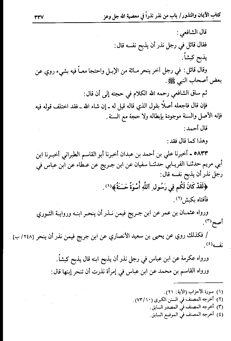 قال أحمد : وهذا كما قال فقد 5833 - أخبرنا علي بن أحمد بن عبدان أخبرنا أبو القاسم الطبراني أخبرنا ابن أبي مريم حدثنا الفريابي حدثنا سفيان عن ابن جريج عن عطاء عن ابن عباس في رجل نذر أن يذبح نفسه قال : {لقد كان لكم في رسول الله أسوة حسنة}.