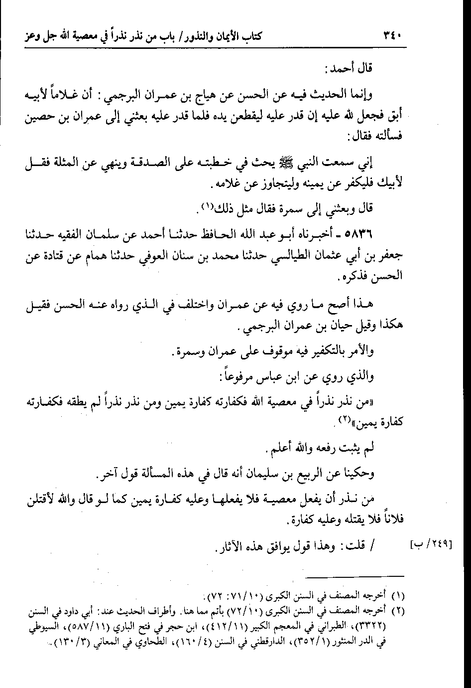 قال أحمد : وإنما الحديث فيه عن الحسن عن هياج بن عمران البرجمي : أن غلاماً لأبيه أبق فجعل لله عليه إن قدر عليه ليقطعن يده فلما قدر عليه بعثني إلى عمران بن حصين فسألته فقال : إني سمعت النبي صلى الله عليه وسلم يحث في خطبته على الصدقة وينهي عن المثلة فقل لأبيك فليكفر عن يمينه وليتجاوز عن غلامه.