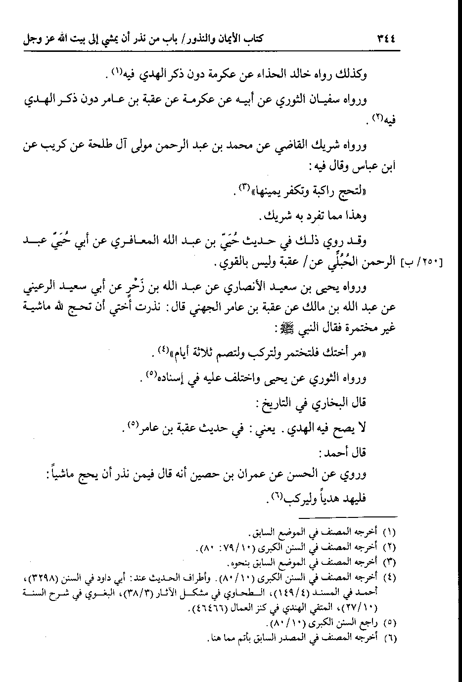 ورواه يحيى بن سعيد الأنصاري عن عبد الله بن زَحْرٍ عن أبي سعيد الرعيني عن عبد الله بن مالك عن عقبة بن عامر الجهني قال : نذرت أختي أن تحج لله ماشية غير مختمرة فقال النبي صلى الله عليه وسلم : مر أختك فلتختمر ولتركب ولتصم ثلاثة أيام.