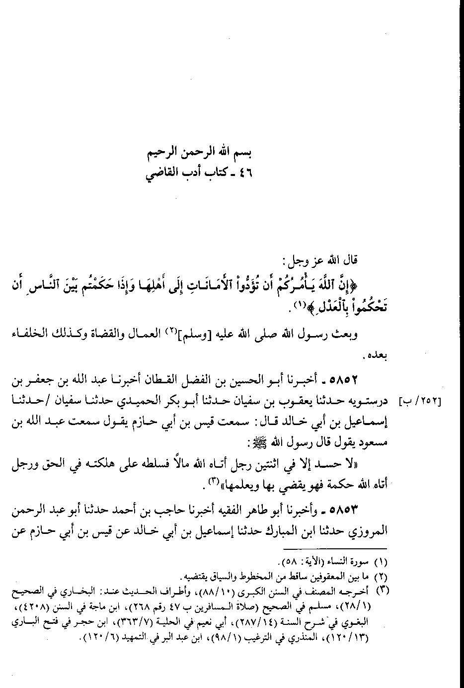 5852 - أخبرنا أبو الحسن بن الفضل القطان أخبرنا عبد الله بن جعفر بن درستويه حدثنا يعقوب بن سفيان حدثنا أبو بكر الحميدي حدثنا سفيان 252 ب حدثنا إسماعيل بن أبي خالد قال : سمعت قيس بن أبي حازم يقول سمعت عبد الله بن مسعود يقول قال رسول الله صلى الله عليه وسلم : لا حسد إلا في اثنتين رجل أتاه الله مالاً فسلطه على هلكته في الحق ورجل أتاه الله حكمة فهو يقضي بها ويعلمها.