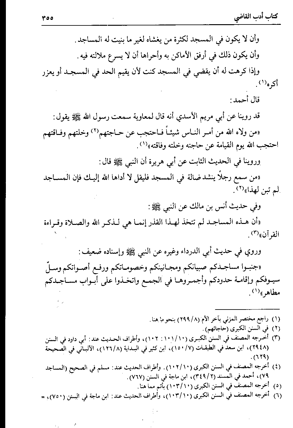 وروي في حديث أبي الدرداء وغيره عن النبي صلى الله عليه وسلم وإسناده ضعيف : جنبوا مساجدكم صبيانكم ومجانينكم وخصوماتكم ورفع أصواتكم وسلّ سيوفكم وإقامة حدودكم وأجمروها في الجمع واتخذوا على أبواب مساجدكم مطاهر.
