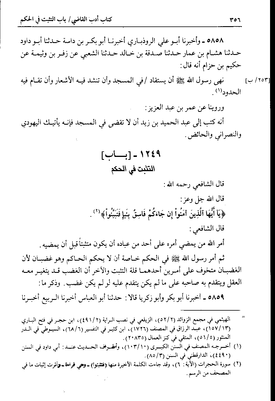 قال الشافعي : أمر الله من يمضي أمره على أحد من عباده أن يكون متثبتاً قبل أن يمضيه.