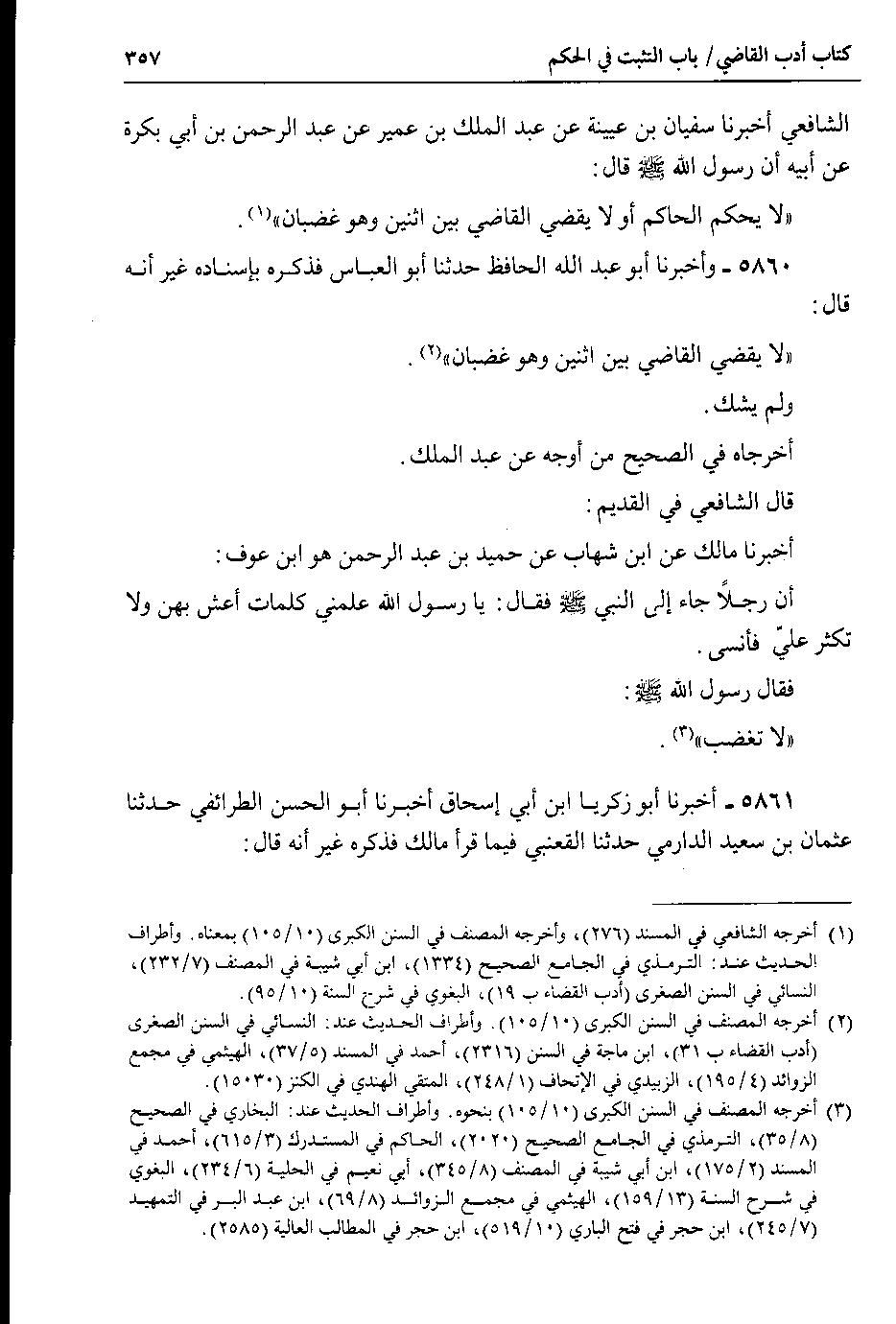 5860 - وأخبرنا أبو عبد الله الحافظ حدثنا أبو العباس فذكره بإسناده غير أنه قال : لا يقضي القاضي بين اثنين وهو غضبان.
