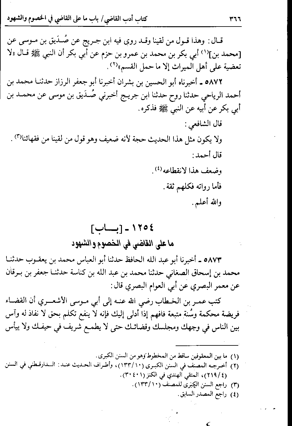 5873 - أخبرنا أبو عبد الله الحافظ حدثنا أبو العباس محمد بن يعقوب حدثنا محمد بن إسحاق الصغاني حدثنا محمد بن عبد الله بن كناسة حدثنا جعفر بن برقان عن معمر البصري عن أبي العوام البصري قال : كتب عمر بن الخطاب رضي الله عنه إلى أبي موسى الأشعري أن القضاء فريضة محكمة وسُنة متبعة فافهم إذا أدلى إليك فإنه لا ينفع تكلم بحق لا نفاذ له وآس بين الناس في وجهك ومجلسك وقضائك حتى لا يطمع شريف في حيفك ولا ييأس
