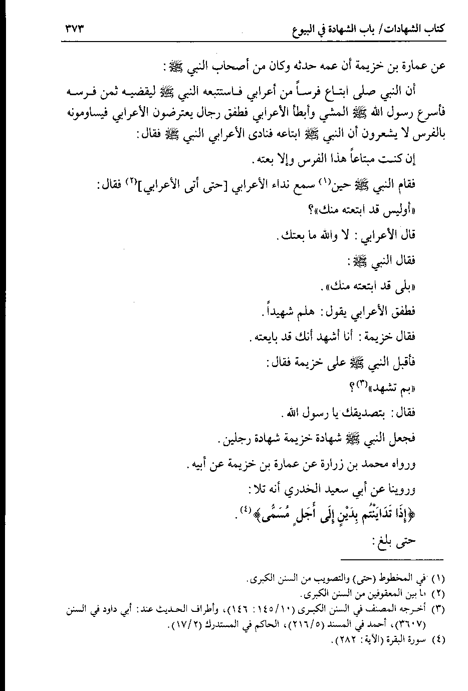 عن عمارة بن خزيمة أن عمه حدثه وكان من أصحاب النبي صلى الله عليه وسلم : أن النبي صلى ابتاع فرساً من أعرابي فاستتبعه النبي صلى الله عليه وسلم ليقضيه ثمن فرسه فأسرع رسول الله صلى الله عليه وسلم المشي وأبطأ الأعرابي فطفق رجال يعترضون الأعرابي فيساومونه بالفرس لا يشعرون أن النبي صلى الله عليه وسلم ابتاعه فنادى الأعرابي النبي صلى الله عليه وسلم فقال : إن كنت مبتاعاً هذا الفرس وإلا بعته.