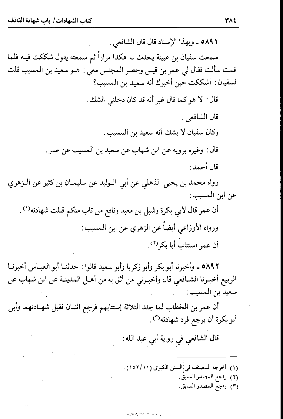 5891 - وبهذا الإسناد قال قال الشافعي : سمعت سفيان بن عيينة يحدث به هكذا مراراً ثم سمعته يقول شككت فيه فلما قمت سألت فقال لي عمر بن قيس وحضر المجلس معي : هو سعيد بن المسيب قلت لسفيان : أشككت حين أخبرك أنه سعيد بن المسيب ؟ قال : لا هو كما قال غير أنه قد كان دخلني الشك.