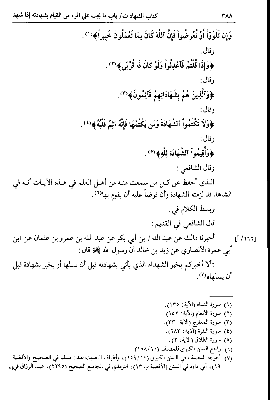 وقال الشافعي : الذي أحفظ عن كل من سمعت منه من أهل العلم في هذه الآيات أنه في الشاهد قد لزمته الشهادة وأن فرضاً عليه أن يقوم بها.