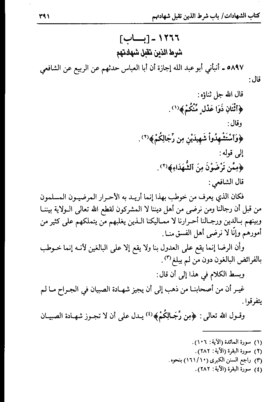 5897 - أنبأني أبو عبد الله إجازة أن أبا العباس حدثهم عن الربيع عن الشافعي قال : قال الله جل ثناؤه : {اثنان ذوا عدل منكم}.