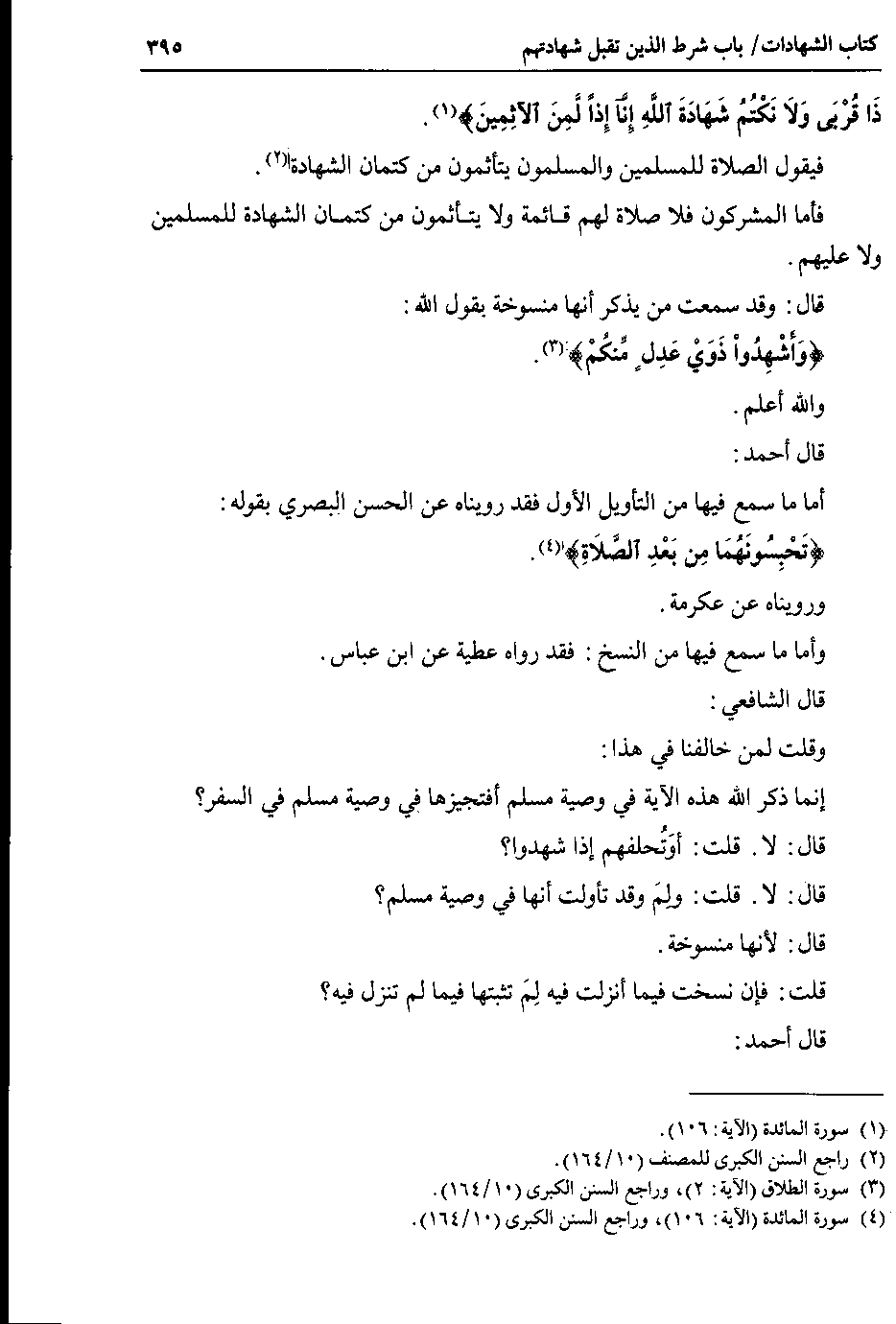 قال الشافعي : وقلت لمن خالفنا في هذا : إنما ذكر الله هذه الآية في وصية مسلم أفتجيزها في وصية مسلم في السفر ؟ قال : لا . قلت : أوَتُحلفهم إذا شهدوا ؟ قال : لا . قلت : ولِمَ وقد تأولت أنها في وصية مسلم ؟ قال : لأنها منسوخة.