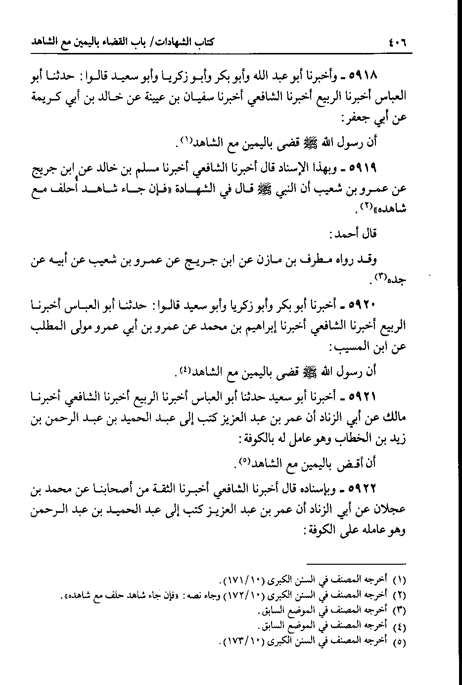 5919 - وبهذا الإسناد قال أخبرنا الشافعي أخبرنا مسلم بن خالد عن ابن جريج عن عمرو بن شعيب أن النبي صلى الله عليه وسلم قال في الشهادة فإن جاء شاهد أُحلف مع شاهده.