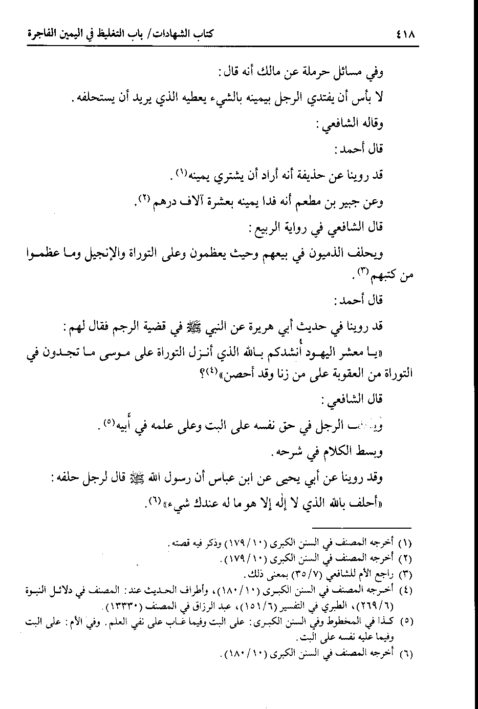 قال أحمد : قد روينا في حديث أبي هريرة عن النبي صلى الله عليه وسلم في قضية الرجم فقال لهم : يا معشر اليهود أُنشدكم بالله الذي أنزل التوراة على موسى ما تجدون في التوراة من العقوبة على من زنا وقد أحصن ؟ قال الشافعي : ويطلب الرجل في حق نفسه على البت وعلى علمه في أبيه.