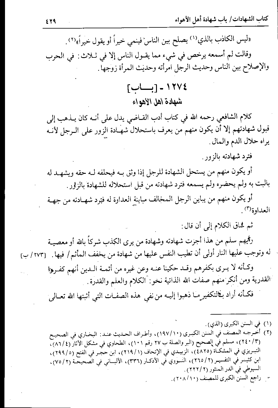 ثم ساق الكلام إلى أن قال : وأيهم سلم من هذا أجزت شهادته وشهادة من يرى الكذب شركاً بالله أو معصية له وتوجب عليها النار أولى أن تطيب النفس عليها من شهادة من يخفف المأثم 273 ب فيها وكأنه لا يرى بكفرهم وقد حكينا عنه وعن غيره من أئمة الدين أنهم كفروا القدرية ومن أنكر منهم صفات الله الذاتية نحو : الكلام والعلم والقدرة.