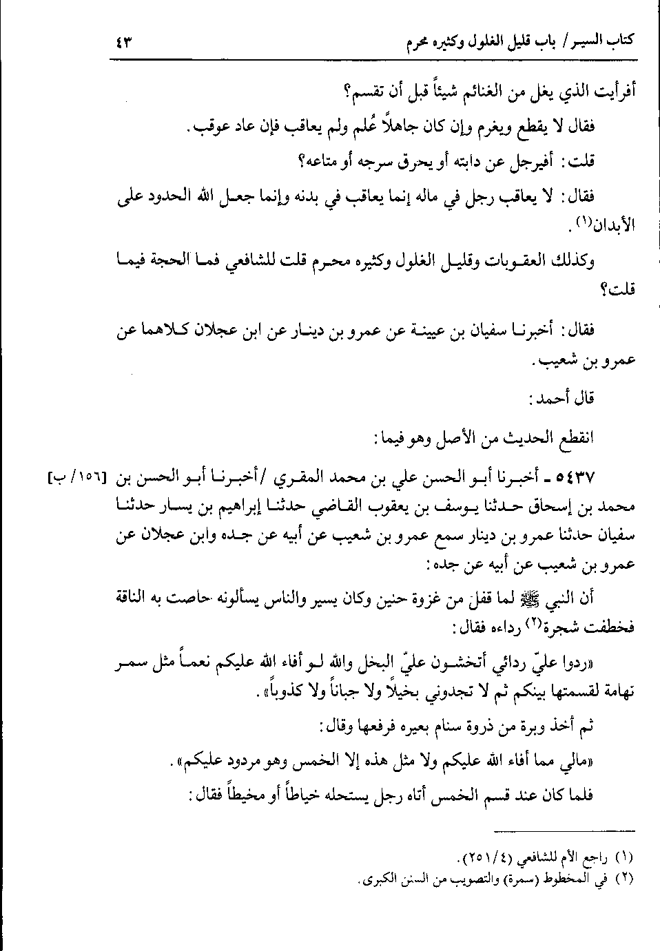 وكذلك العقوبات وقليل الغلول وكثيره محرم قلت للشافعي فما الحجة فيما قلت ؟ فقال : أخبرنا سفيان بن عيينة عن عمرو بن دينار عن ابن عجلان كلاهما عن عمرو بن شعيب.