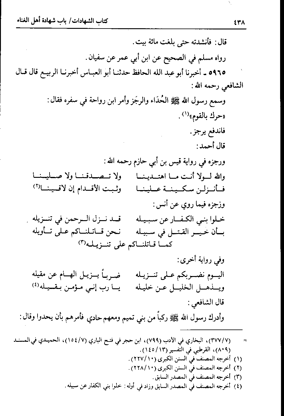 قال أحمد : ورجزه في رواية قيس بن أبي حازم رحمه الله % ( والله لولا أنت ما اهتدينا % ولا تصدقنا ولا صلينا ) % % ( فأنزلن سكنية علينا % وثبت الأقدام إن لاقينا ) % ورجزه فيما روي عن أنس % ( خلوا بني الكفار عن سبيله % قد نزل الرحمن في تنزيله ) % % ( بأن خير القتل في سبيه % نحن قاتلناكم على تأويله ) % % ( كما قاتلناكم على تنزيله % ) % وفي رواية أخرى % ( اليوم نضربكم على تنزيله % ضرباً يزيل الهام عن مقبله ) % % ( ويذهل الخليل عن خليله % يا رب إني مؤمن بقيله ) % قال الشافعي : وأدرك رسول الله صلى الله عليه وسلم ركباً من بني تميم ومعهم حادي فأمرهم بأن يحدوا وقال