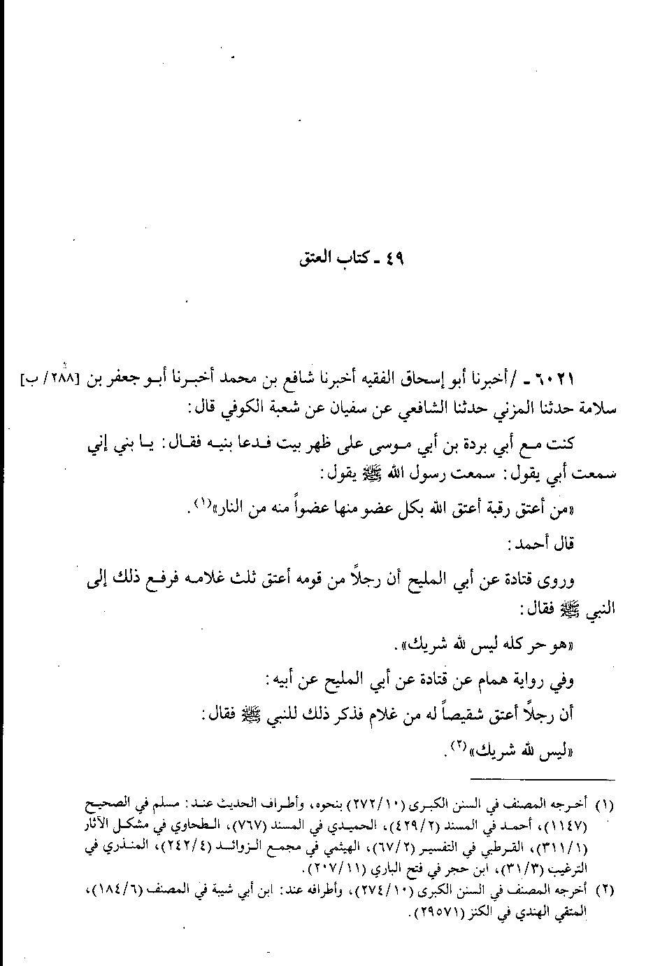 6021 - 288 ب أخبرنا أبو إسحاق الفقيه أخبرنا شافع بن محمد أخبرنا أبو جعفر سلامة حدثنا المزني حدثنا الشافعي عن سفيان عن شعبة الكوفي قال : كنت مع أبي بردة بن أبي موسى على ظهر بيت فدعا بنيه فقال : يا بني إني سمعت أبي يقول : سمعت رسول الله صلى الله عليه وسلم يقول : من أعتق رقبة أعتق الله بكل عضو منها عضواً منه من النار.