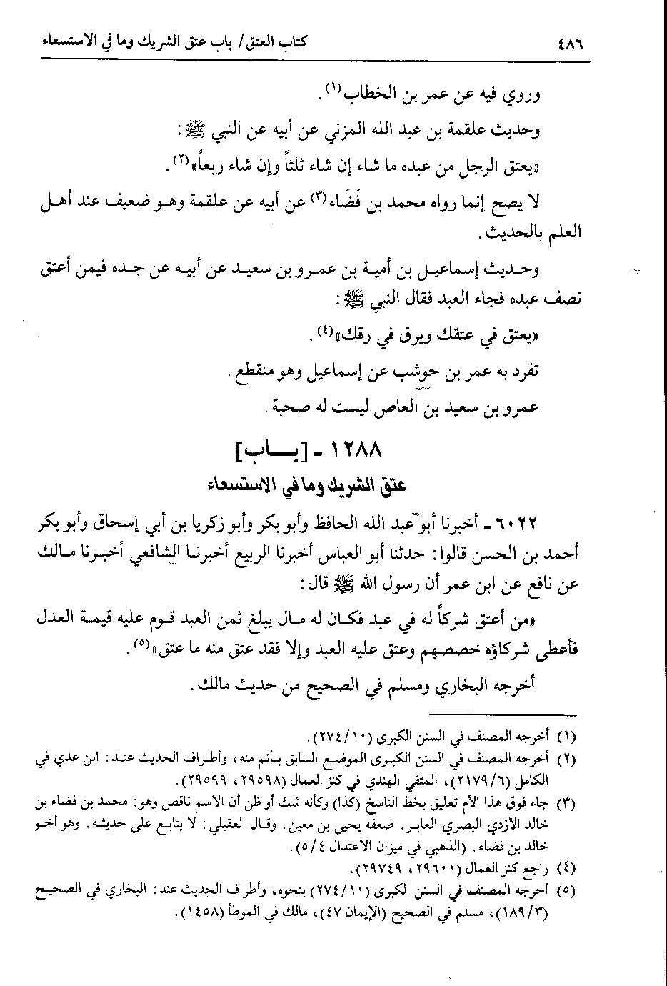 6022 - أخبرنا أبو عبد الله الحافظ وأبو بكر وأبو زكريا بن أبي إسحاق وأبو بكر أحمد بن الحسن قالوا : حدثنا أبو العباس أخبرنا الربيع أخبرنا الشافعي أخبرنا مالك عن نافع عن ابن عمر أن رسول الله صلى الله عليه وسلم قال : من أعتق شركاً له في عبد فكان له مال يبلغ ثمن العبد قوم عليه قيمة العدل فأعطى شركاؤه حصصهم وعتق عليه العبد وإلا فقد عتق منه ما عتق.