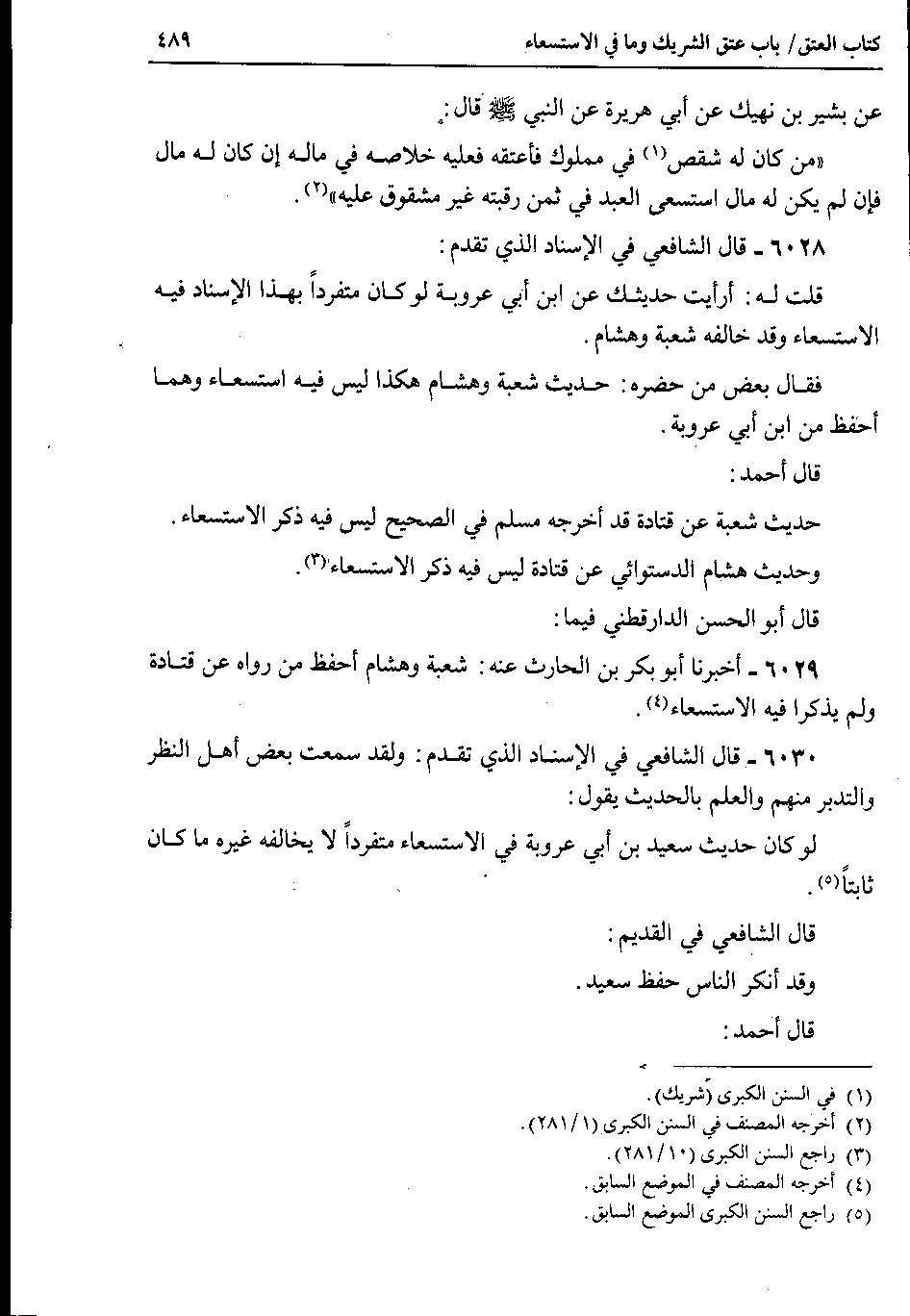 6030 - قال الشافعي في الإسناد الذي تقدم : ولقد سمعت بعض أهل النظر والتدبر منهم والعلم بالحديث يقول : لو كان حديث سعيد بن أبي عروبة في الاستسعاء متفرداً لا يخالفه غيره ما كان ثابتاً.