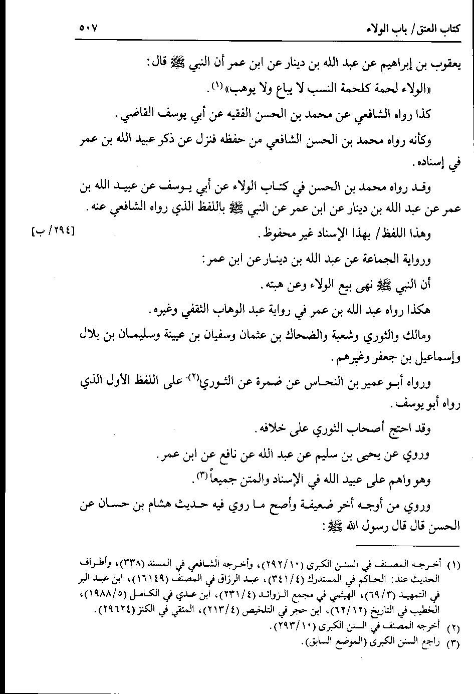 وقد رواه محمد بن الحسن في كتاب الولاء عن أبي يوسف عن عبيد الله بن عمر عن عبد الله بن دينار عن ابن عمر عن النبي صلى الله عليه وسلم باللفظ الذي رواه الشافعي عنه.