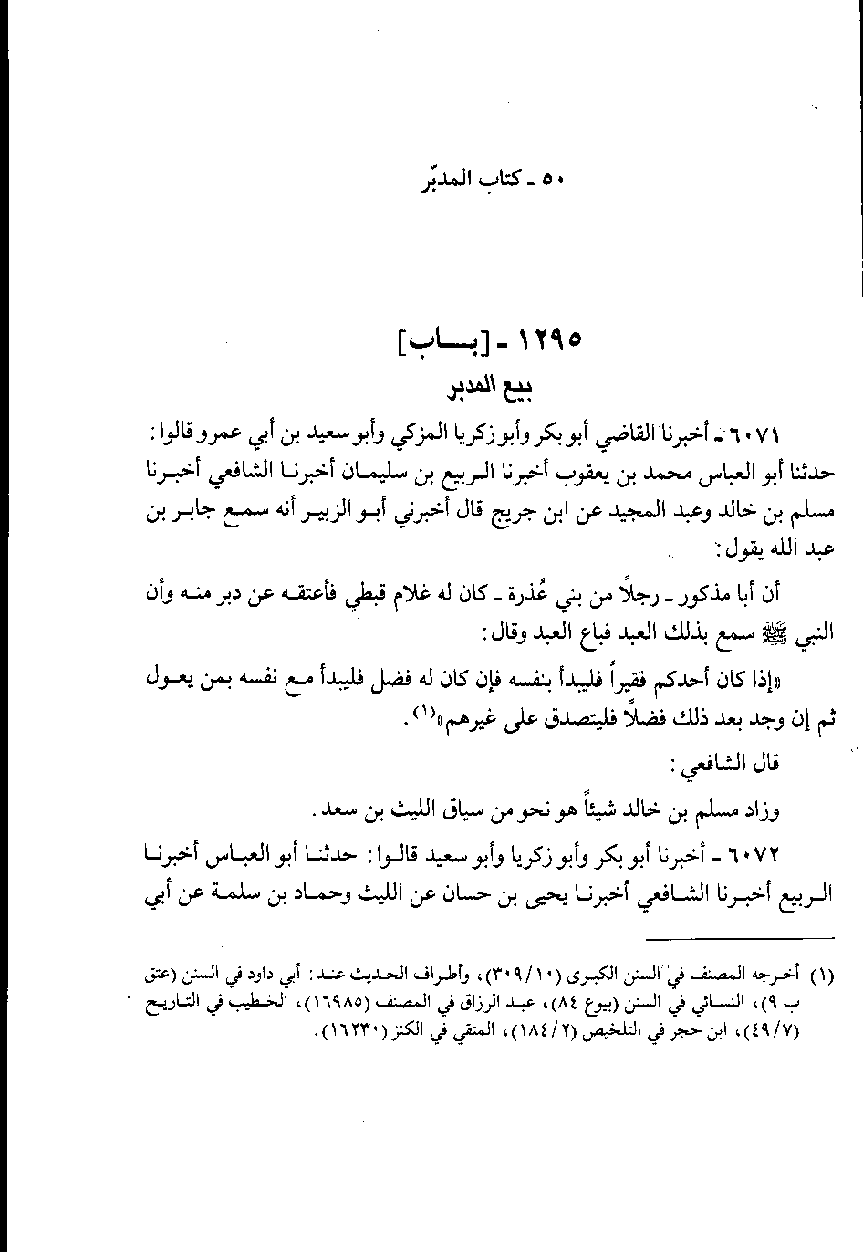 6071 - أخبرنا القاضي أبو بكر وأبو زكريا المزكي وأبو سعيد بن أبي عمرو قالوا حدثنا أبو العباس محمد بن يعقوب أخبرنا الربيع بن سليمان أخبرنا الشافعي أخبرنا مسلم بن خالد وعبد المجيد عن ابن جريج قال أخبرني أبو الزبير أنه سمع جابر بن عبد الله يقول : أن أبا مذكور - رجلاً من بني عُذرة - كان له غلام قبطي فأعتقه عن دبر منه وأن النبي صلى الله عليه وسلم سمع بذلك العبد فباع العبد وقال : إذا كان أحدكم فقيراً فليبدأ بنفسه فإن كان له فضل فليبدأ مع نفسه بمن يعول ثم إن وجد بعد ذلك فضلاً فليتصدق على غيرهم.