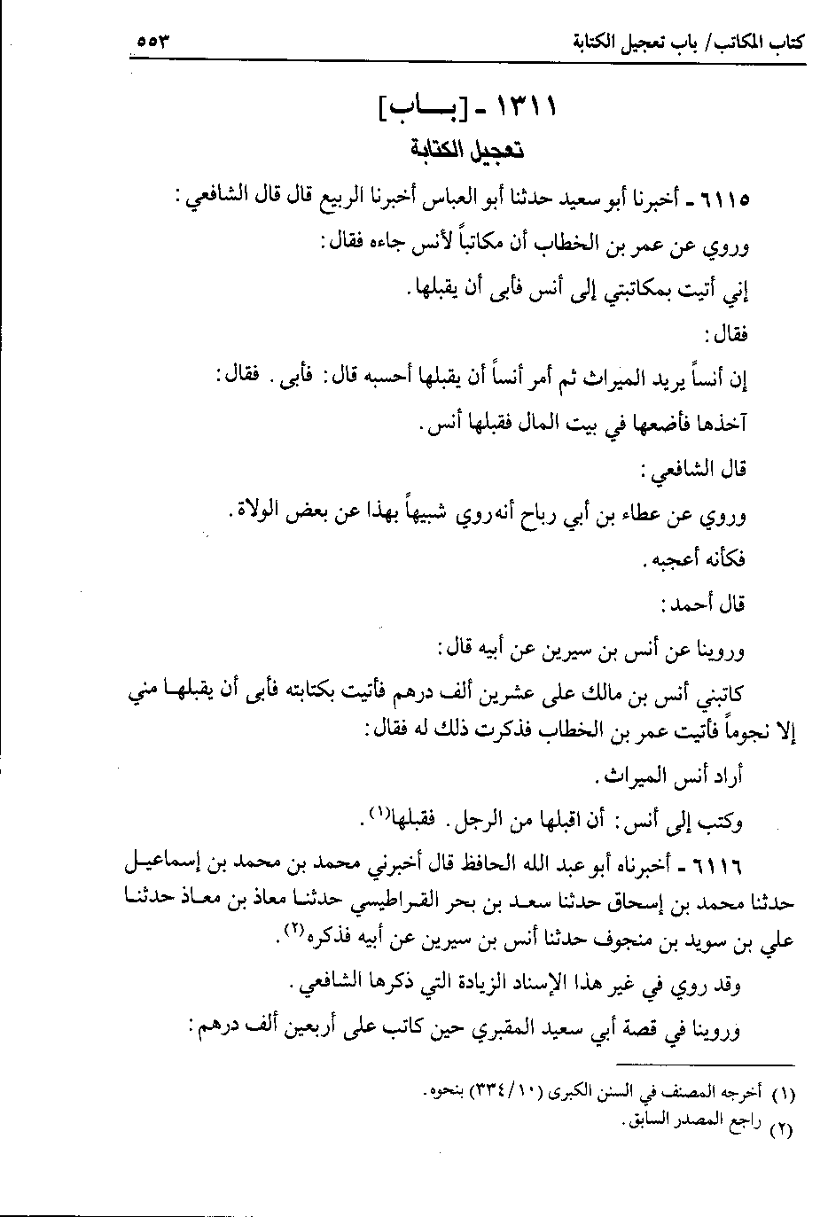 6115 - أخبرنا أبو سعيد حدثنا أبو العباس أخبرنا الربيع قال قال الشافعي : وروي عن عمر بن الخطاب أن مكاتباً لأنس جاءه فقال : إني أتيت بمكاتبتي إلى أنس فأبى أن يقبلها.