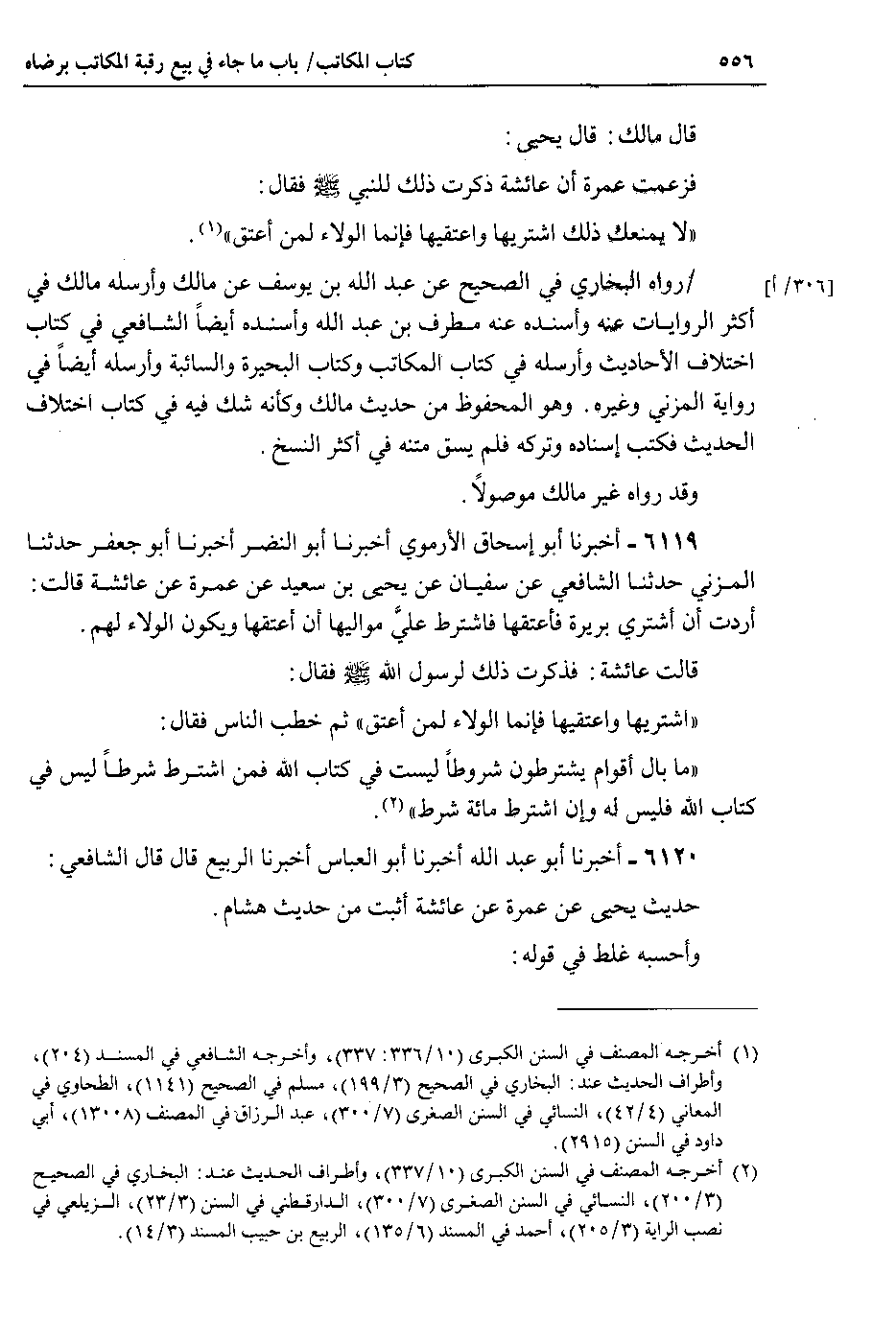 306 أ رواه البخاري في الصحيح عن عبد الله بن يوسف عن مالك وأرسله مالك في أكثر الروايات عنه وأسنده عنه مطرف بن عبد الله وأسنده أيضاً الشافعي في كتاب اختلاف الأحاديث وأرسله في كتاب المكاتب وكتاب البحيرة والسائبة وأرسله أيضاً في رواية المزني وغيره . وهو المحفوظ من حديث مالك وكأنه شك فيه في كتاب اختلاف الحديث فكتب إسناده وتركه فلم يسق متنه في أكثر النسخ.