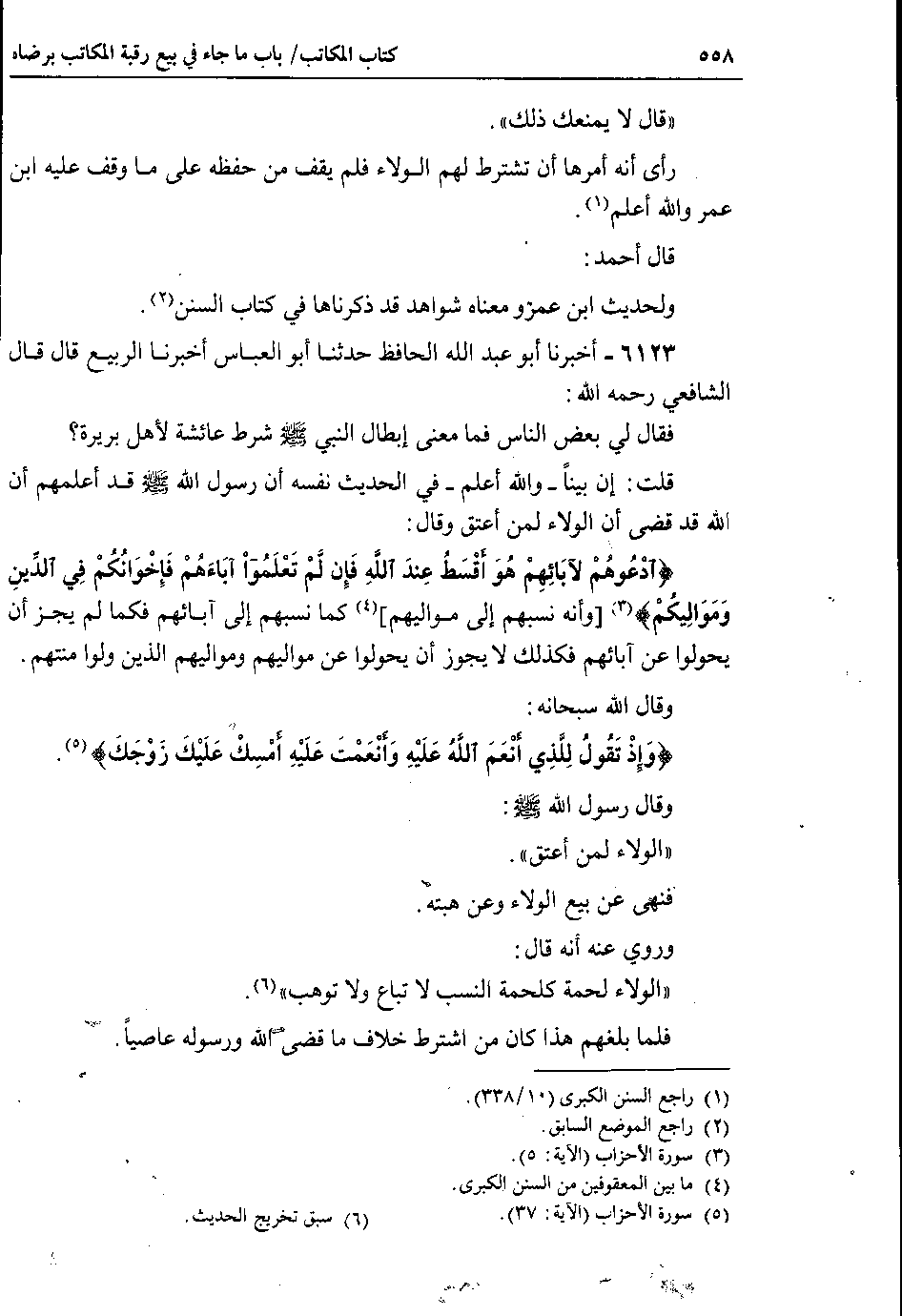 6123 - أخبرنا أبو عبد الله الحافظ حدثنا أبو العباس أخبرنا الربيع قال قال الشافعي رحمه الله : فقال لي بعض الناس فما معنى إبطال النبي صلى الله عليه وسلم شرط عائشة لأهل بريرة ؟ قلت : إن بيناً - والله أعلم - في الحديث نفسه أن رسول الله صلى الله عليه وسلم قد أعلمهم أن الله قد قضى أن الولاء لمن أعتق وقال : {ادعوهم لآبائهم هو أقسط عند الله فإن لم تعلموا آباءهم فإخوانكم في الدين ومواليكم} وأنه نسبهم إلى مواليهم كما نسبهم إلى آبائهم فكما لم يجز أن يحولوا عن آبائهم فكذلك لا يجوز أن يحولوا عن مواليهم ومواليهم الذين ولوا منتهم.