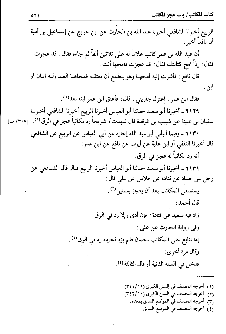 6130 - وفيما أنبأني أبو عبد الله إجازة عن أبي العباس عن الربيع عن الشافعي قال أخبرنا الثقفي أو ابن علية عن أيوب عن نافع عن ابن عمر : أنه رد مكاتباً له عجز في الرق.