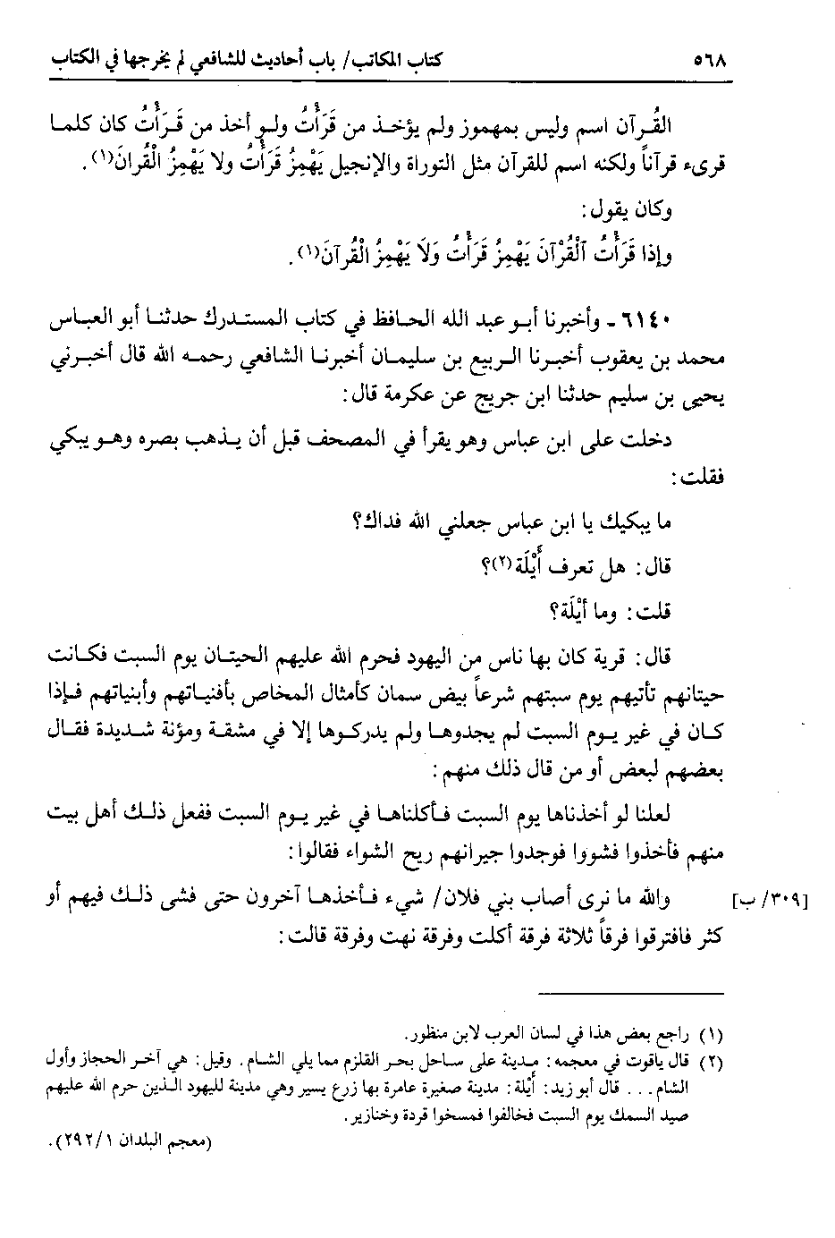 6140 - وأخبرنا أبو عبد الله الحافظ في كتاب المستدرك حدثنا أبو العباس محمد بن يعقوب أخبرنا الربيع بن سليمان أخبرنا الشافعي رحمه الله قال أخبرني يحيى بن سليم حدثنا ابن جريج عن عكرمة قال : دخلت على ابن عباس وهو يقرأ في المصحف قبل أن يذهب بصره وهو يبكي فقلت : ما يبكيك يا ابن عباس جعلني الله فداك ؟ قال : هل تعرف أَيْلة ؟ قلت : وما أَيْلَة ؟ قال : قرية كلها بها ناس من اليهود فحرم الله عليهم الحيتان يوم السبت فكانت حيتانهم تأتيهم يوم سبتهم شرعاً بيض سمان كأمثال المخاص بأفنياتهم وأبنياتهم فإذا كان في يغر يوم السبت لم يجدوها ولم يدركوها إلا في مشقة ومؤنة شديدة فقال بعضهم لبعض أو من قال ذلك منهم : لعلنا لو أخذناها يوم السبت فأكلناها في غير يوم السبت ففعل ذلك أهل بيت منهم فأخذوا فشووا فوجدوا جيرانهم ريح الشواء فقالوا : والله ما نرى أصاب بني فلان 309 ب شيء فأخذها آخرون حتى فشى ذلك فيهم أو كثر فافترقوا فرقاً ثلاثة فرقة أكلت وفرقة نهت وفرقة قالت