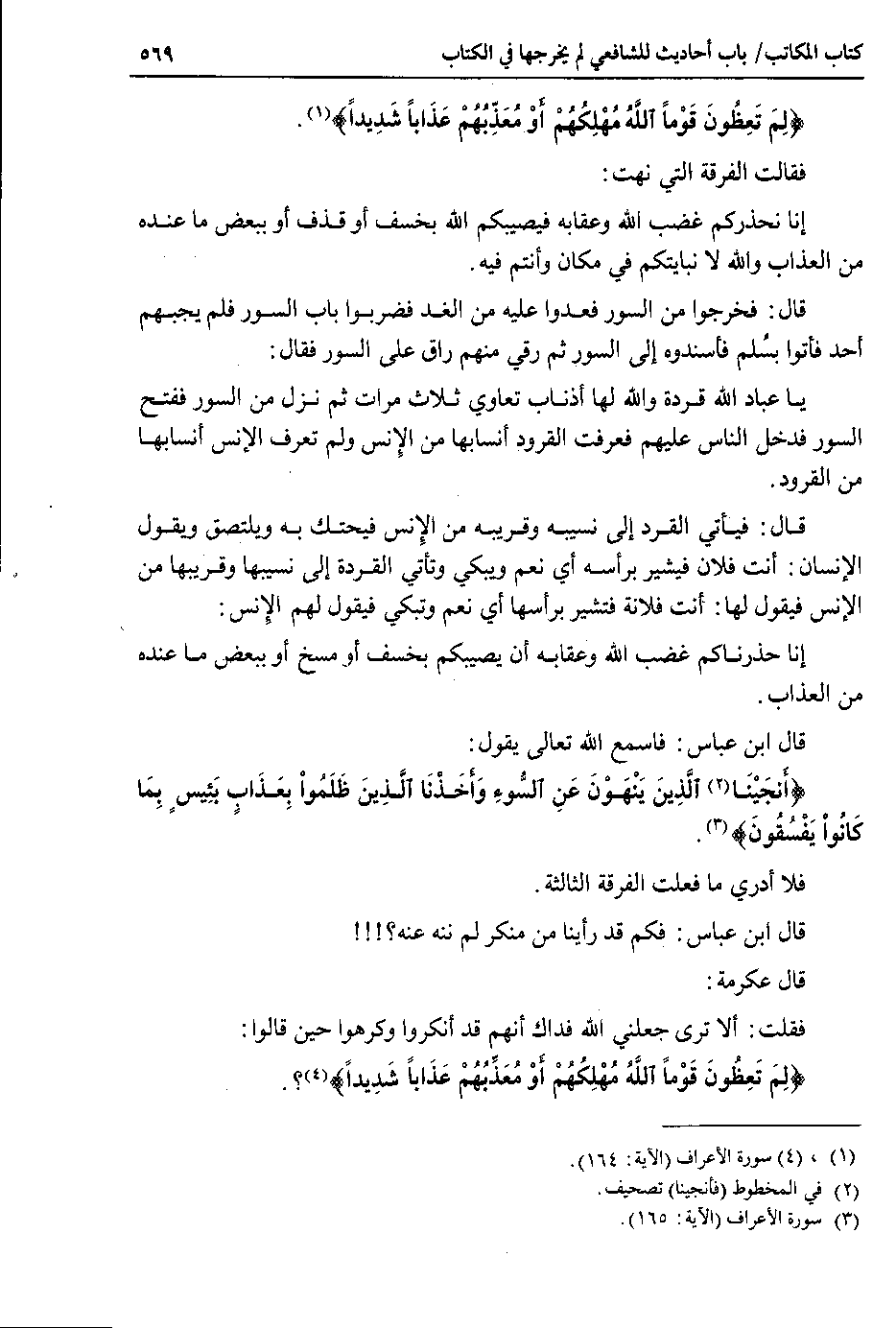 قال ابن عباس : فكم قد رأينا من منكر لم ننه عنه ؟ ! ! ! قال عكرمة : فقلت : ألا ترى جعلني الله فداك أنهم قد أنكروا وكرهوا حين قالوا : {لم تعظون قوما الله مهلكهم أو معذبهم عذابا شديدا} ؟.