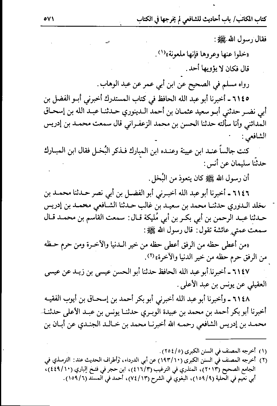 6145 - أخبرنا أبو عبد الله الحافظ في كتاب المستدرك أخبرني أبو الفضل بن أبي نضر حدثني أبو سعيد عثمان بن أحمد الدينوري حدثنا عبد الله بن إسحاق المدائني وأنا سألته حدثنا الحسن بن محمد الزعفراني قال سمعت محمد بن إدريس الشافعي : كنت جالساً عند ابن عيينة وعنده ابن المبارك فذكر البُخل فقال ابن المبارك حدّثنا سليمان عن أنس : أن رسول الله صلى الله عليه وسلم كان يتعوذ من البُخل.