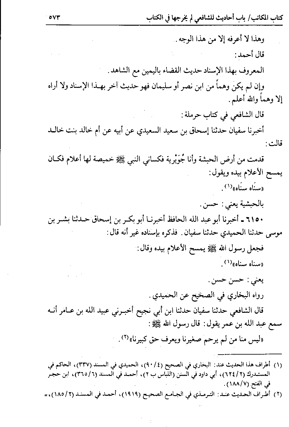 قال الشافعي حدثنا سفيان حدثنا ابن أبي نجيح أخبرني عبيد الله بن عامر أنه سمع عبد الله بن عمر يقول : قال رسول الله صلى الله عليه وسلم : ليس منا من لم يرحم صغيرنا ويعرف حق كبيرنا.