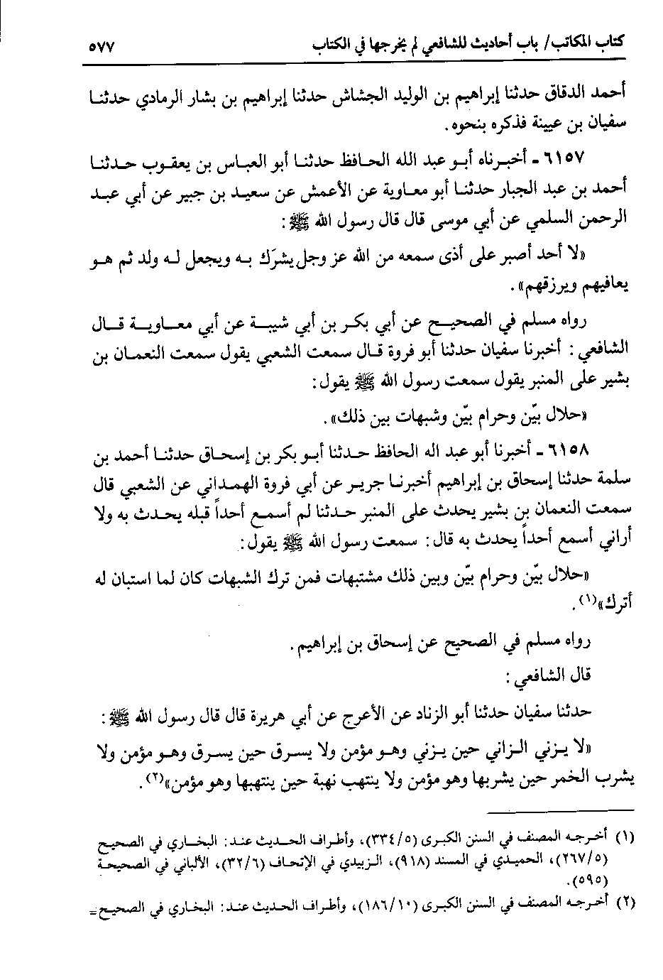 رواه مسلم في الصحيح عن أبي بكر بن أبي شيبة عن أبي معاوية قال الشافعي : أخبرنا سفيان حدثنا أبو فروة قال سمعت الشعبي يقول سمعت النعمان بن بشير على المنبر يقول سمعت رسول الله صلى الله عليه وسلم يقول : حلال بيّن وحرام بيّن وشبهات بين ذلك.