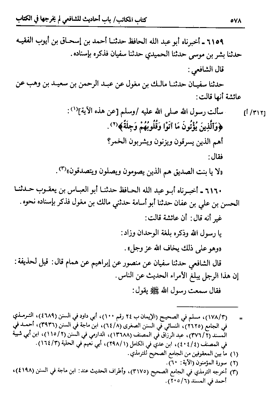 قال الشافعي : حدثنا سفيان حدثنا مالك بن مغول عن عبد الرحمن بن سعيد بن وهب عن عائشة أنها قالت : سألت رسول الله صلى الله عليه 312 أ وسلم عن هذه الآية.