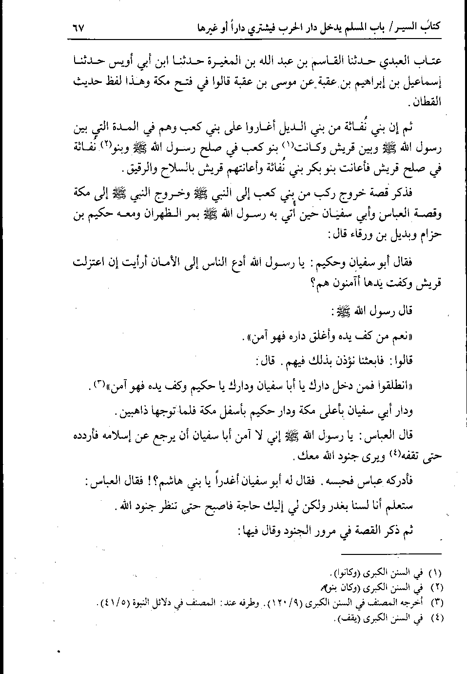 فذكر قصة خروج ركب من بني كعب إلى النبي صلى الله عليه وسلم وخروج النبي صلى الله عليه وسلم إلى مكة وقصة العباس وأبي سفيان حين أُتي به رسول الله صلى الله عليه وسلم بمر الظهران ومعه حكيم بن حزام وبديل بن ورقاء قال : فقال أبو سفيان وحكيم : يا رسول الله أدع الناس إلى الأمان أرأيت إن اعتزلت قريش وكفت يدها أآمنون هم ؟ قال رسول الله صلى الله عليه وسلم : نعم من كف يده وأغلق داره فهو آمن.