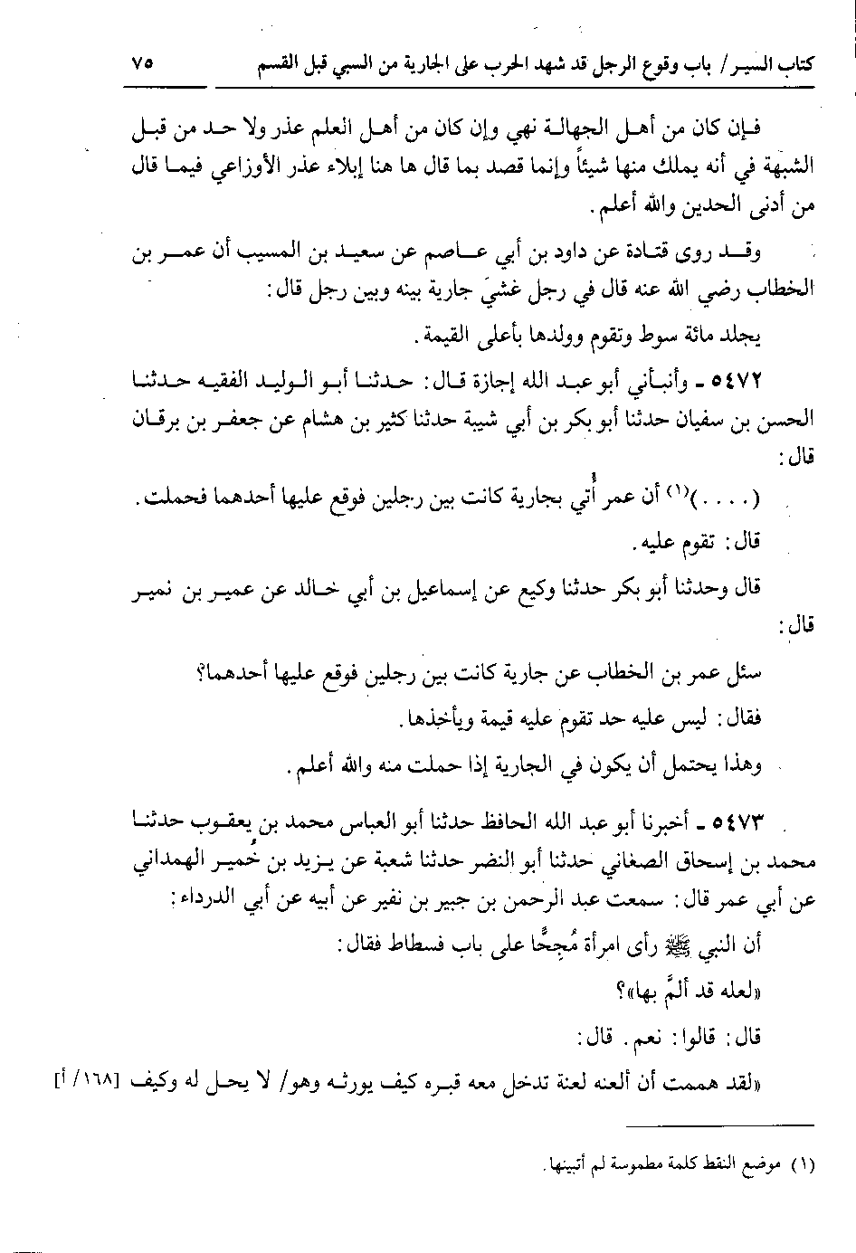 5472 - وأنبأني أبو عبد الله إجازة قال : حدثنا أبو الوليد الفقيه حدثنا الحسن بن سفيان حدثنا أبو بكر بن أبي شيبة حدثنا كثير بن هشام عن جعفر بن برقان قال : ( . . . ) أن عمر أُتي بجارية كانت بين رجلين فوقع عليها أحدهما فحملت.