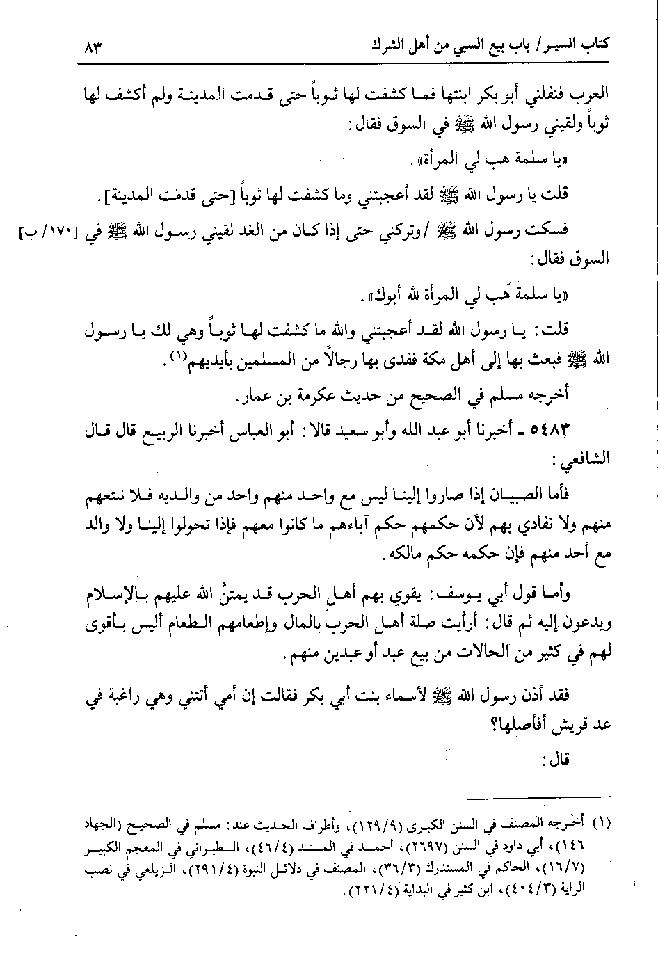 العرب فنفلني أبو بكر ابنتها فما كشفت لها ثوباً حتى قدمت المدينة ولم أكشف لها ثوباً ولقيني رسول الله صلى الله عليه وسلم في السوق فقال : يا سلمة هب لي المرأة.