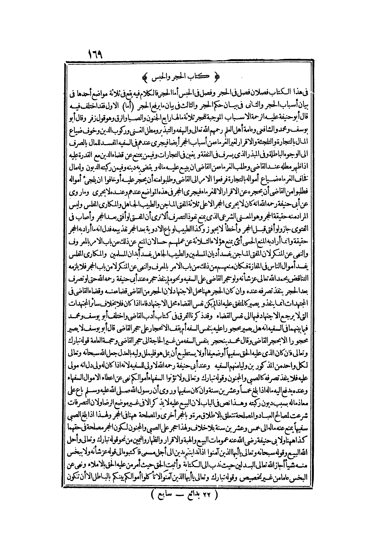 وَالْحَبْسِ فِي هَذَا الْكِتَابِ فَصْلَانِ: فَصْلٌ فِي الْحَجْرِ، وَفَصْلٌ فِي الْحَبْسِ، أَمَّا الْحَجْرُ فَالْكَلَامُ فِيهِ يَقَعُ فِي ثَلَاثَةِ مَوَاضِعَ: أَحَدُهَا: فِي بَيَانِ أَسْبَابِ الْحَجْرِ، وَالثَّانِي: فِي بَيَانِ حُكْمِ الْحَجْرِ، وَالثَّالِثُ: فِي بَيَانِ مَا يَرْفَعُ الْحَجْرَ.