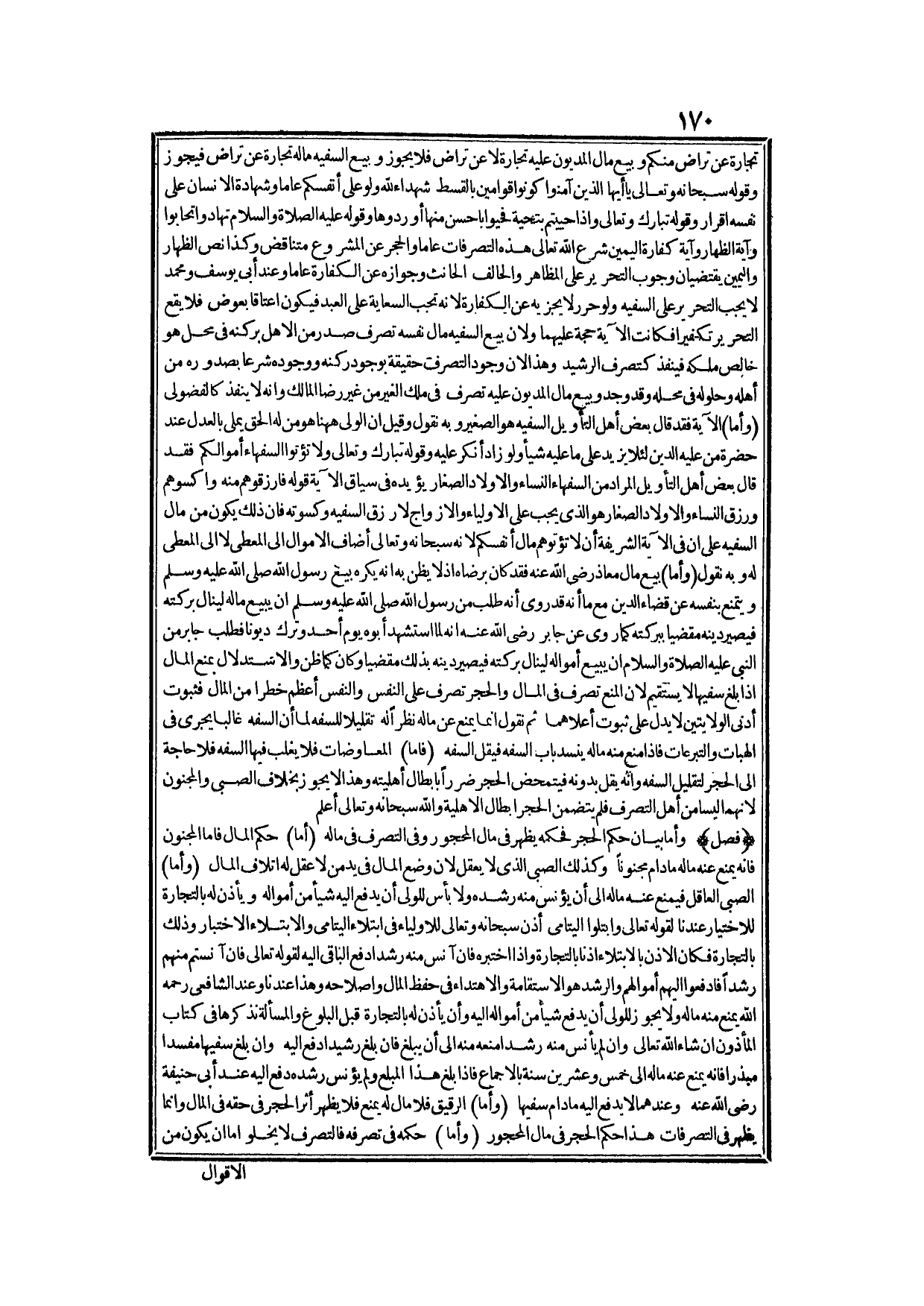 وَبَيْعُ مَالِ الْمَدْيُونِ عَلَيْهِ تِجَارَةً لَا عَنْ تَرَاضٍ فَلَا يَجُوزُ وَبَيْعُ السَّفِيهِ مَالَهُ تِجَارَةٌ عَنْ تَرَاضٍ فَيَجُوزُ وَقَوْلِهِ سُبْحَانَهُ وَتَعَالَى {يَا أَيُّهَا الَّذِينَ آمَنُوا كُونُوا قَوَّامِينَ بِالْقِسْطِ شُهَدَاءَ لِلَّهِ وَلَوْ عَلَى أَنْفُسِكُمْ} [النساء: 135] عَامًّا وَشَهَادَةُ الْإِنْسَانِ عَلَى نَفْسِهِ إقْرَارٌ وَقَوْلِهِ تَبَارَكَ وَتَعَالَى {وَإِذَا حُيِّيتُمْ بِتَحِيَّةٍ فَحَيُّوا بِأَحْسَنَ مِنْهَا أَوْ رُدُّوهَا} [النساء: 86] وَقَوْلِهِ - عَلَيْهِ الصَّلَاةُ وَالسَّلَامُ - «تَهَادَوْا تَحَابُّوا» وَآيَةِ الظِّهَارِ وَآيَةِ كَفَّارَةِ الْيَمِينِ، شَرَعَ اللَّهُ تَعَالَى هَذِهِ التَّصَرُّفَاتِ عَامًّا وَالْحَجْرُ عَنْ الْمَشْرُوعِ مُتَنَاقِضٌ، وَكَذَا نَصُّ الظِّهَارِ وَالْيَمِينِ يَقْتَضِيَانِ وُجُوبَ التَّحْرِيرِ عَلَى الْمُظَاهِرِ وَالْحَالِفِ الْحَانِثِ وَجَوَازَهُ عَنْ الْكَفَّارَةِ عَامًّا.
