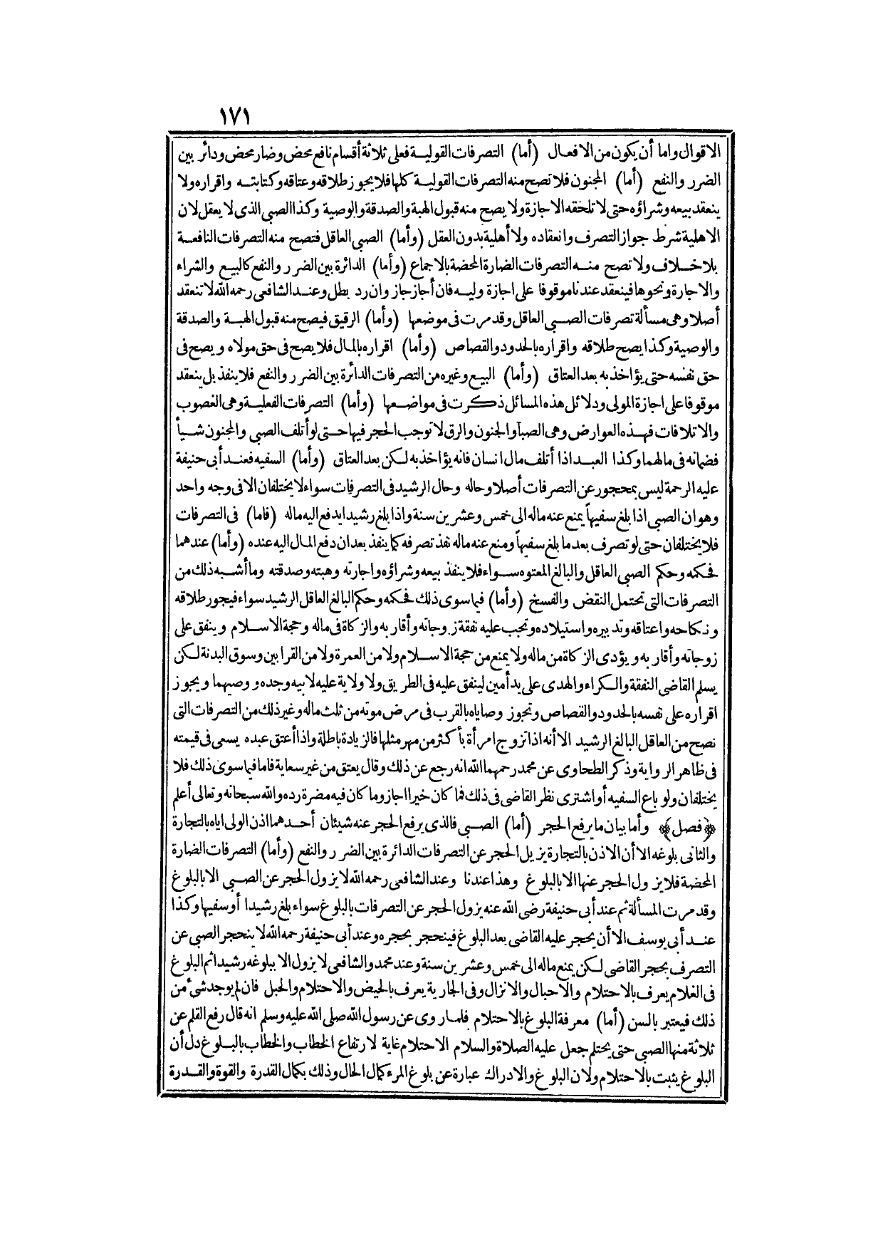(أَمَّا) التَّصَرُّفَاتُ الْقَوْلِيَّةُ فَعَلَى ثَلَاثَةِ أَقْسَامٍ: نَافِعٍ مَحْضٍ، وَضَارٍّ مَحْضٍ وَدَائِرٍ بَيْنَ الضَّرَرِ وَالنَّفْعِ.
