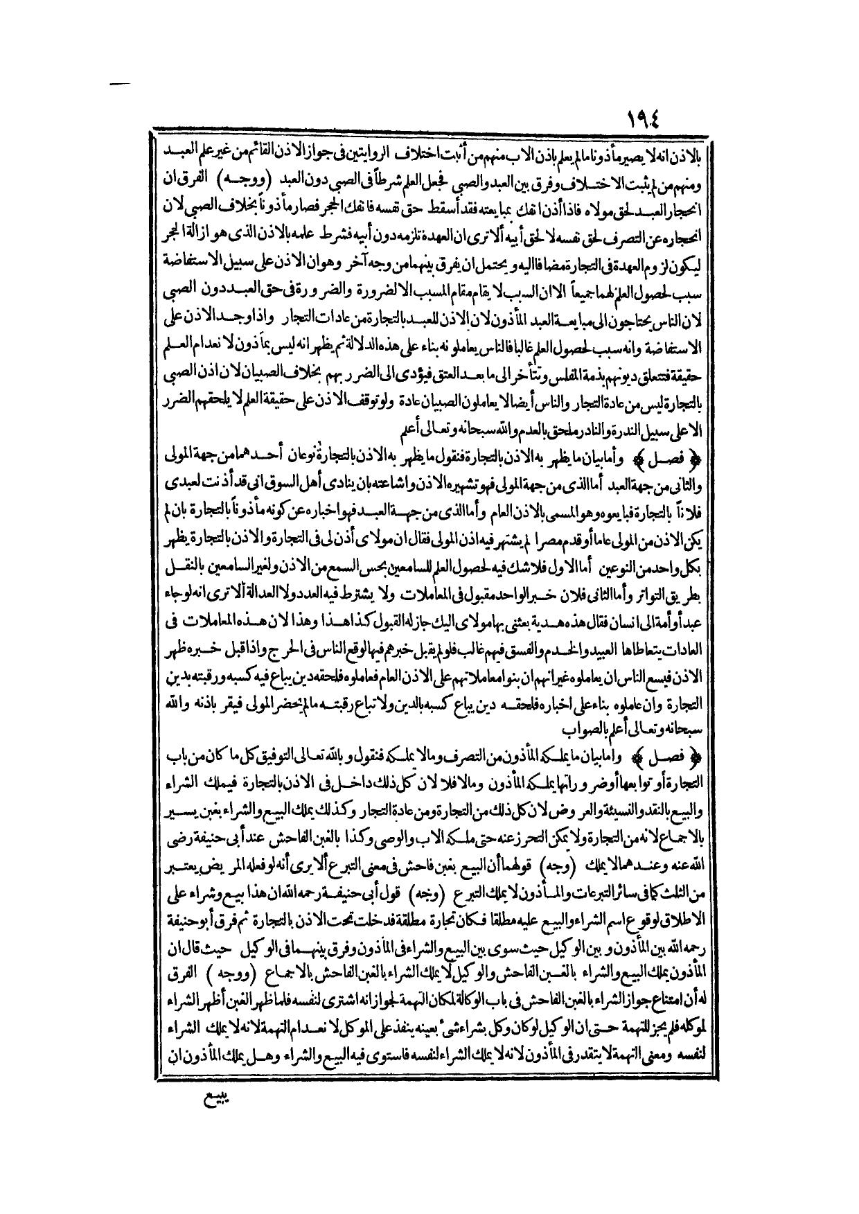 (وَلَنَا) أَنَّ تَقْيِيدَ الْإِذْنِ بِالنَّوْعِ غَيْرُ مُفِيدٍ فَيَلْغُو اسْتِدْلَالًا بِالْمُكَاتَبِ وَهَذَا؛ لِأَنَّ فَائِدَةَ الْإِذْنِ بِالتِّجَارَةِ تَمْكِينُ الْعَبْدِ مِنْ تَحْصِيلِ النَّفْعِ الْمَطْلُوبِ مِنْ التِّجَارَةِ وَهُوَ الرِّبْحُ، وَهَذَا فِي النَّوْعَيْنِ عَلَى نَمَطٍ وَاحِدٍ، وَكَذَا الضَّرَرُ الَّذِي يَلْزَمُهُ فِي الْعَقْدِ عَسَى لَا يَتَفَاوَتُ فَكَانَ الرِّضَا بِالضَّرَرِ فِي أَحَدِ النَّوْعَيْنِ رِضًا بِهِ فِي النَّوْعِ الْآخَرِ فَلَمْ يَكُنْ التَّقْيِيدُ بِالنَّوْعِ مُفِيدًا فَيَلْغُو، وَيَبْقَى الْإِذْنُ بِالتِّجَارَةِ عَامًّا فَيَتَنَاوَلُ الْأَنْوَاعَ كُلَّهَا مَعَ مَا أَنَّهُ وُجِدَ الْإِذْنُ فِي النَّوْعِ الْآخَرِ دَلَالَةً؛ لِأَنَّ الْغَرَضَ مِنْ الْإِذْنِ هُوَ حُصُولُ الرِّبْحِ، وَالنَّوْعَانِ فِي احْتِمَالِ الرِّبْحِ عَلَى السَّوَاءِ فَكَانَ الْإِذْنُ بِأَحَدِهِمَا إذْنًا بِالْآخَرِ دَلَالَةً، وَلِهَذَا يَمْلِكُ قَبُولَ الْهِبَةِ وَالصَّدَقَةِ مِنْ غَيْرِ إذْنِ الْمَوْلَى صَرِيحًا لِوُجُودِهِ دَلَالَةً كَذَا هَهُنَا.